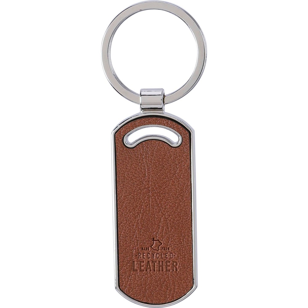 Kulcstartó ovális alakú, újrahasznosított bőrből, fém karikával. Oldalán dombornyomott újrahasznosított bőr anyagra utaló logóval. Egyenként barna kartonhüvelybe csomagolva. Anyaga: újrahasznosított bőr. Emblémázás: Gravírozás