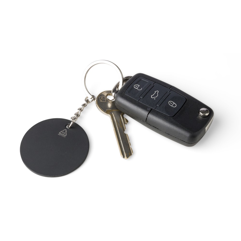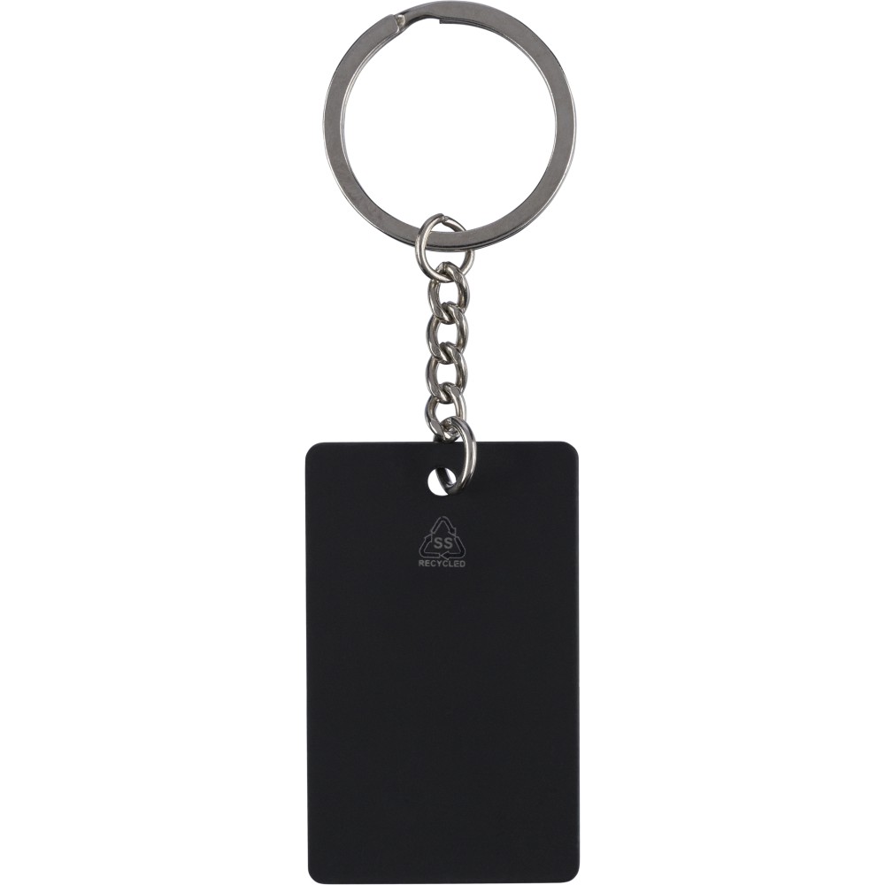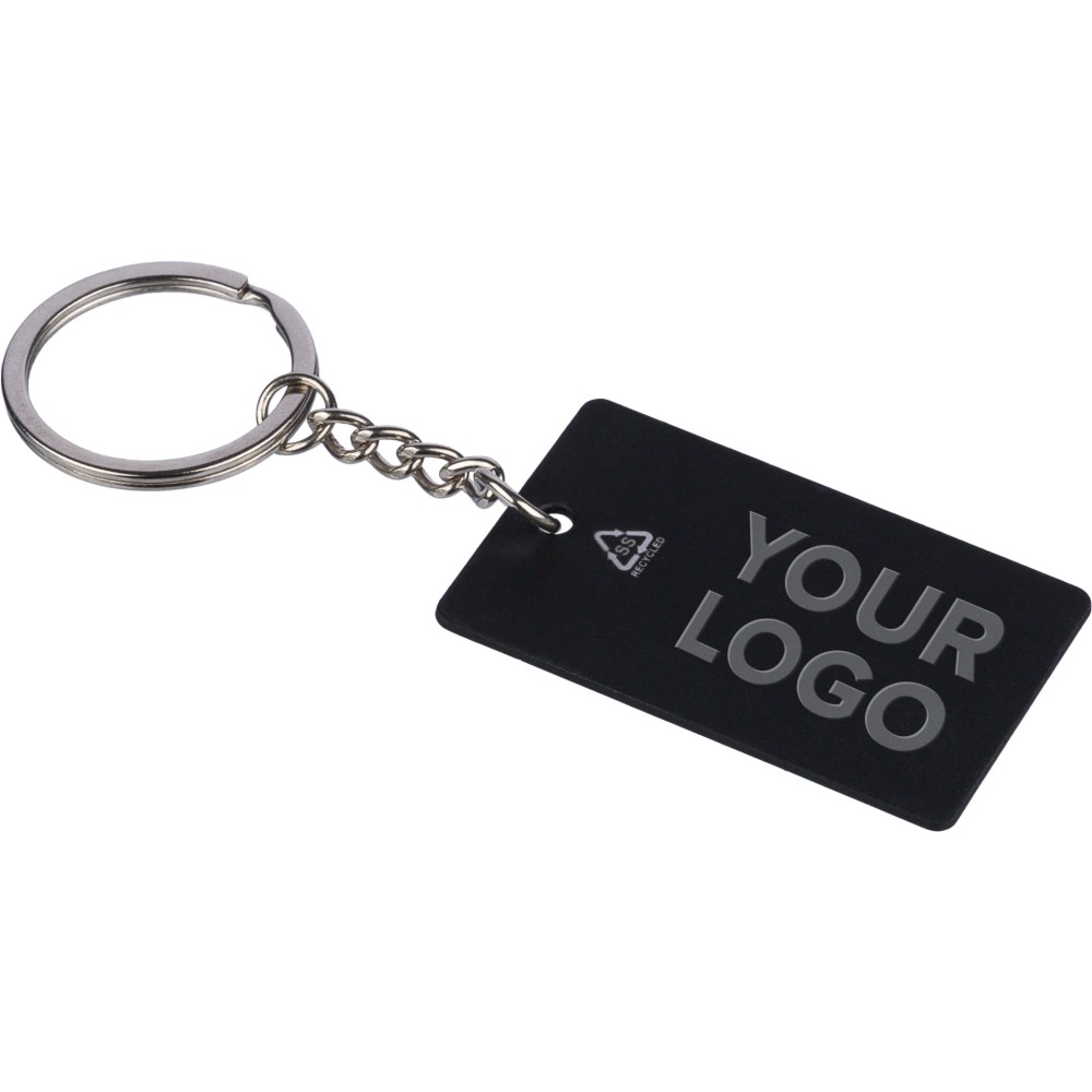 Újrahasznosított rozsdamentes acélból készült, gumírozott felületű, téglalap alakú kulcstartó fém karikával. A kulcstartón gravírozott recycled (újrahasznosított) alapanyagra utaló logó található, amely gravírozás után fényes, tükörszerű hatást mutat. Egyenként kraft papírtasakba csomagolva. Emblémázás: Gravírozás