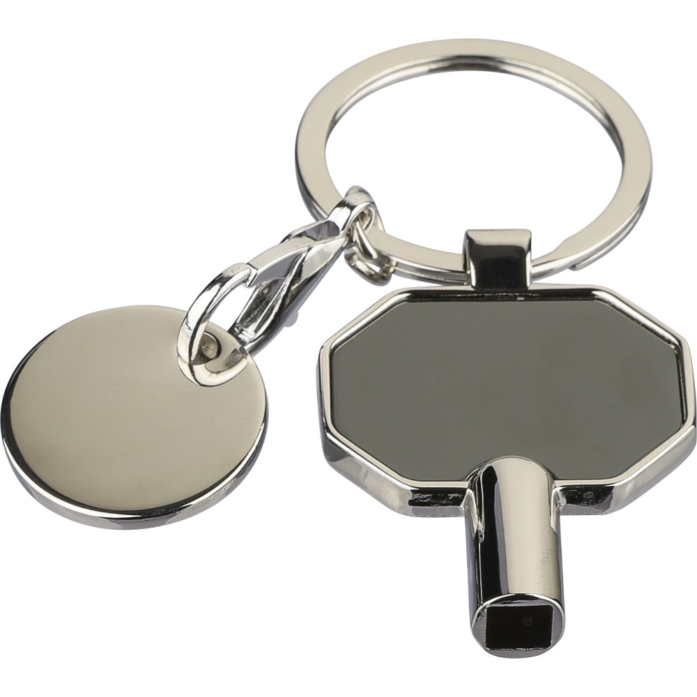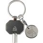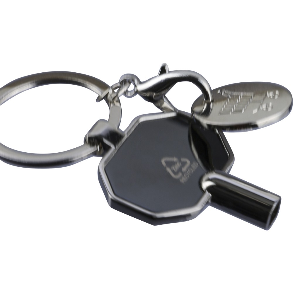 Újrahasznosított cinkötvözetből készült radiátor-légtelenítő kulcstartó bevásárlóérmével. 5×5 mm-es négyszögkulccsal rendelkezik, amely európai szabvány a radiátorok légtelenítéséhez. Erős fém kulcskarikával ellátva, a terméken recycled (újrahasznosított) alapanyagra utaló logó található. Illusztrációval ellátott barna karton borítékban csomagolva. Emblémázás: Gravírozás