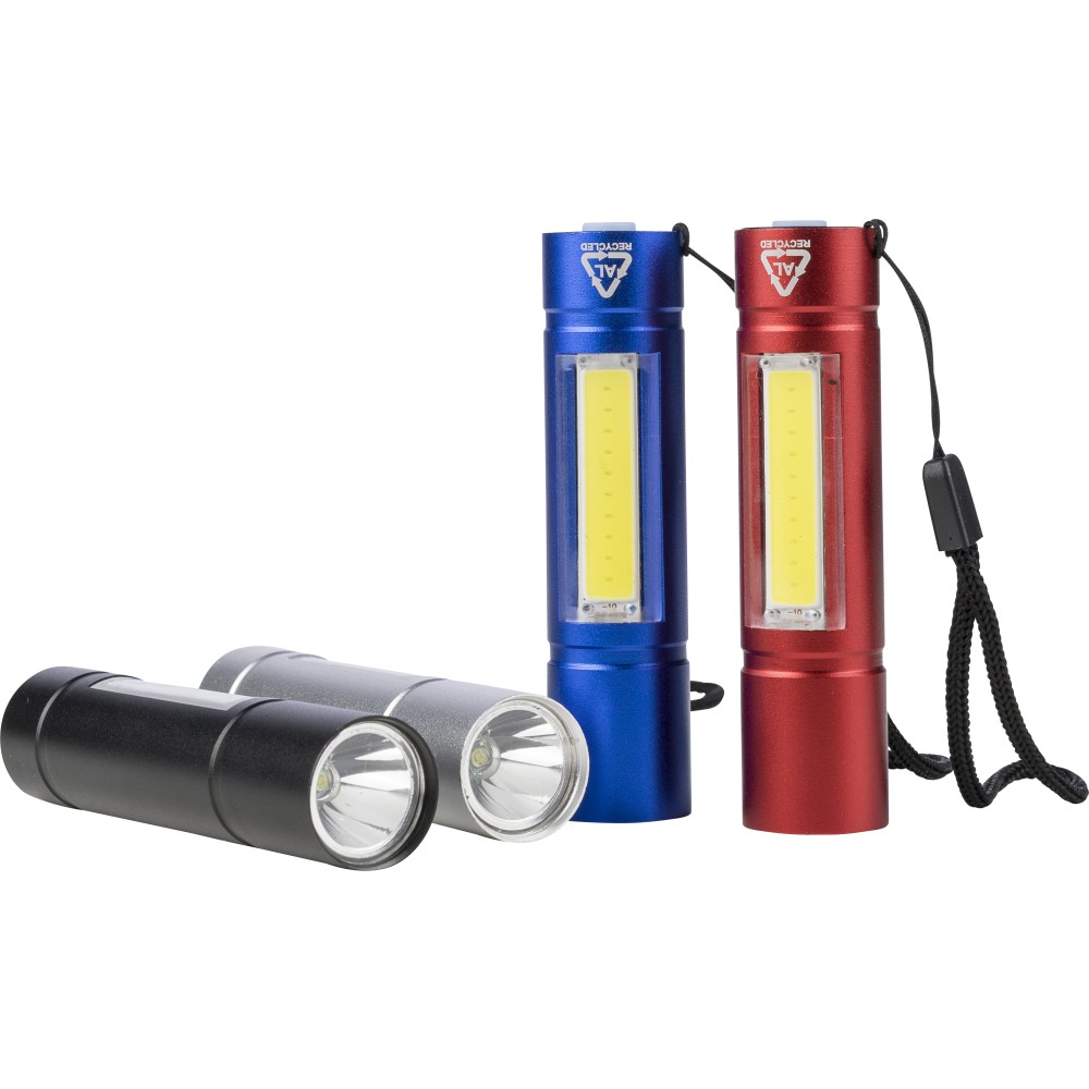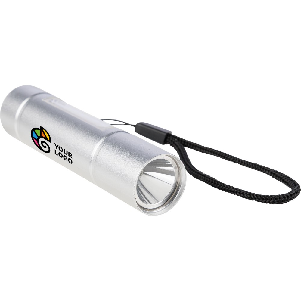 Újrahasznosított alumíniumból készült COB zseblámpa (80-100 lumen) 3 világítási móddal, nyomógombbal, csuklópánttal és gravírozott recycled (újrahasznosított) alapanyagra utaló logóval. USB-C-n keresztül újratölthető (300 mAh), a csomag része egy 30 cm-es kábel. Illusztrációval ellátott barna dobozba csomagolva. Emblémázás: Gravírozás, Tamponnyomás