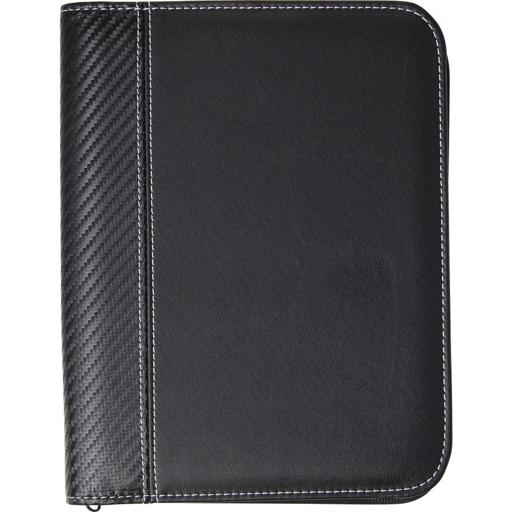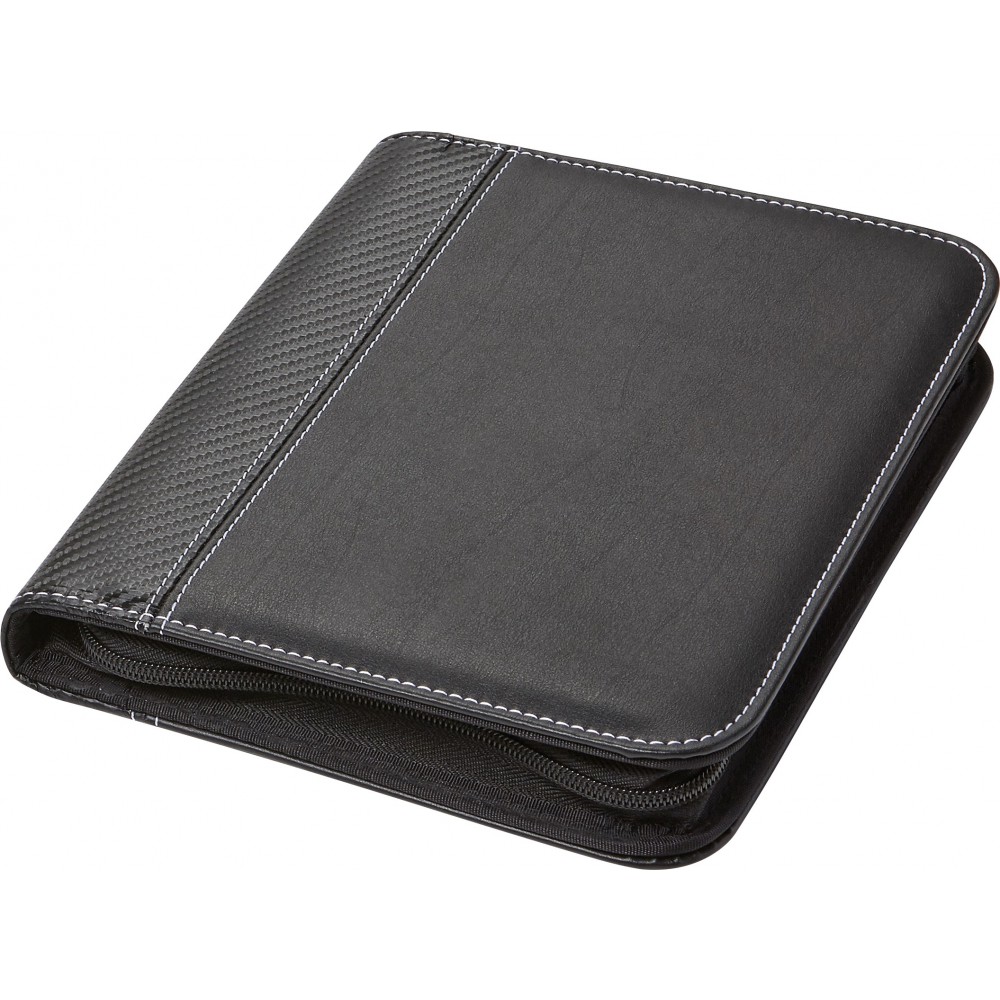 Cipzáros A5 irattartó PU borítással, fehér díszítő tűzésekkel, tolltartó hurokkal, hat különböző méretű zsebbel, 30 lapos, vonalas jegyzettömbbel, mikroszálas béléssel. A tollat nem tartalmazza. Emblémázás: Szitanyomás, Tamponnyomás