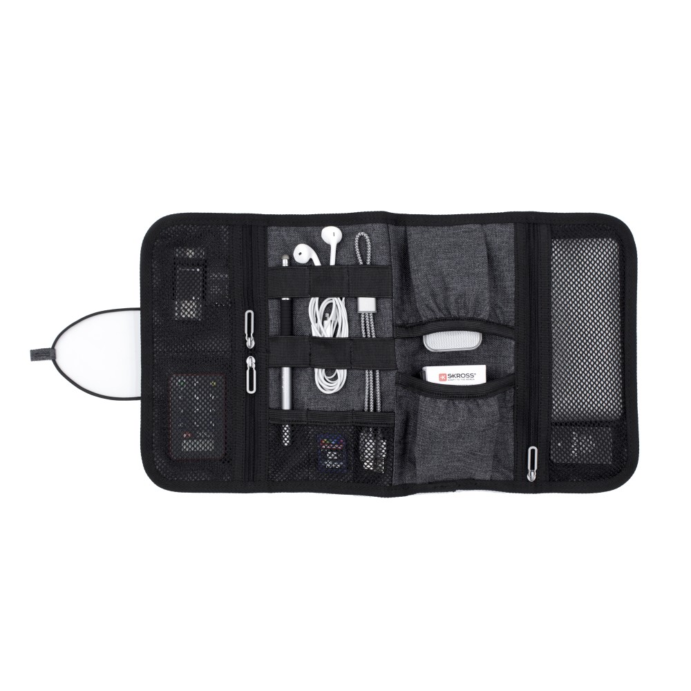 A Folio portfólió tökéletes társ a digitális eszközök és a mindennapi technikai eszközök rendszerezéséhez, miközben az utazási kiegészítők is elférnek benne. A prémium minőségű, víz- és folttaszító 600D poliészterből készült, kompakt kialakításának köszönhetően könnyen elfér a táskában, hátizsákban vagy bőröndben. A praktikus elrendezés 6 elasztikus hurkot tartalmaz a kábelek és eszközök számára, 3 hálós zsebet az olyan apróságok számára, mint az USB-k vagy SD-kártyák, valamint 2 nyitott zsebet a töltők vagy hálózati adapterek számára, így nagyfokú rugalmasságot és állítható belső tárolást kínál. Emblémázás: Gravírozás