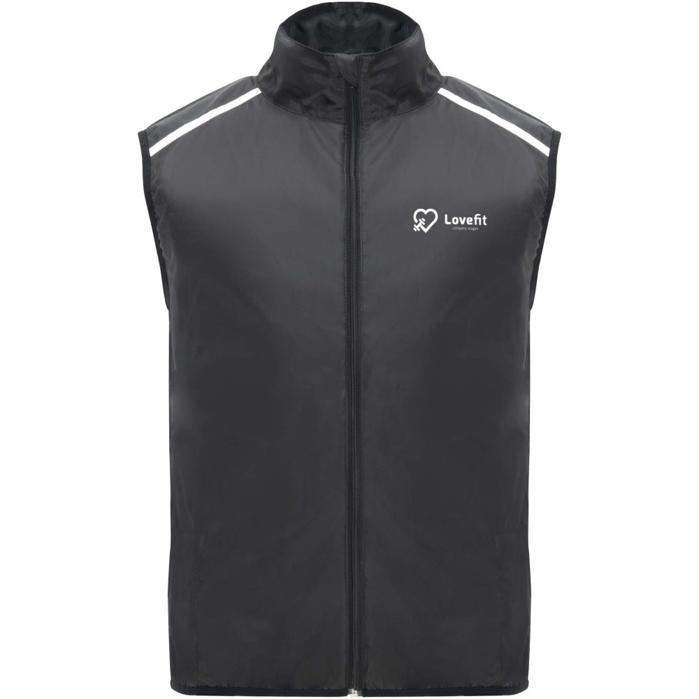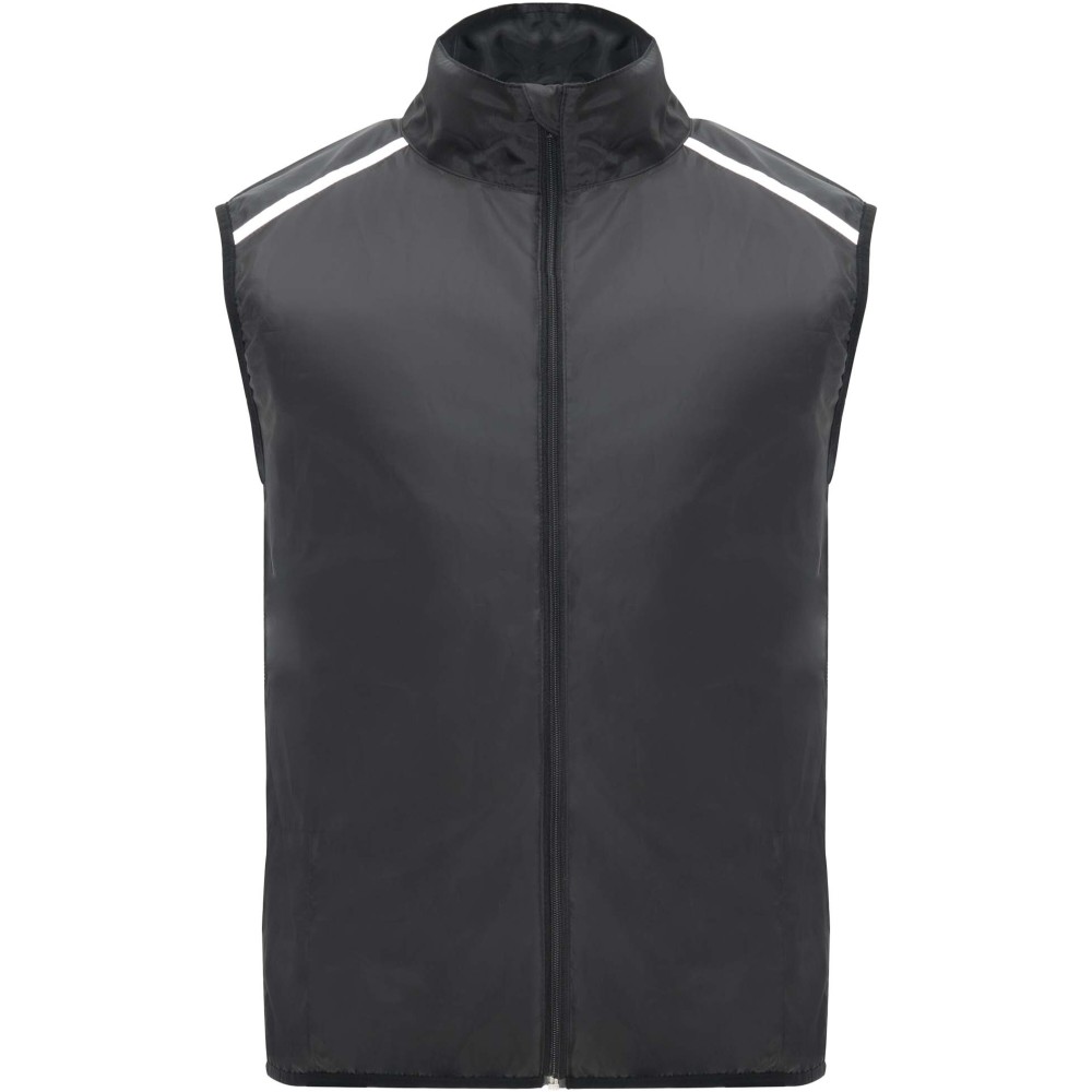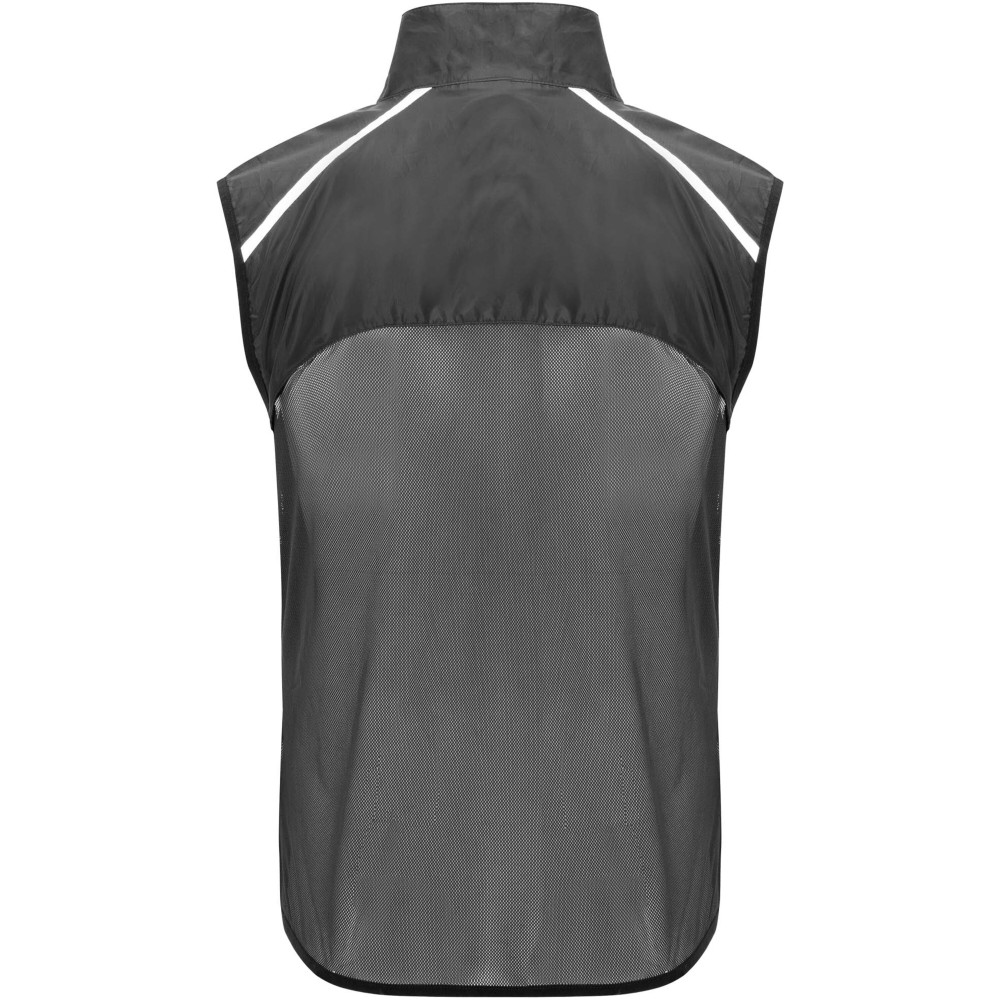 Szélálló és légáteresztő. Elülső cipzár azonos színű állvédővel. Rugalmas szegély a karkivágásnál és az alján. A hát alsó része mikroperforált anyagból készült. Fényvisszaverő csíkok a vállán. Zseb rugalmas pánttal, amelybe a mellényt el lehet csomagolni. Eltávolítható címke. Emblémázás: Szitanyomás