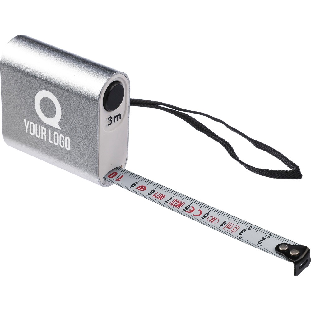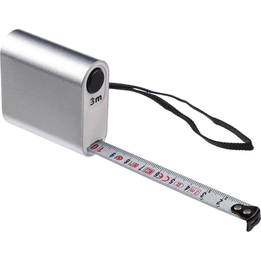 Mérőszalag. 3 méteres, nyomógombbal és centiméter beosztással, csuklópánttal. MID tanúsítvánnyal rendelkezik. Egyenként barna kartondobozba csomagolva. Anyaga: alumínium. Emblémázás: Gravírozás