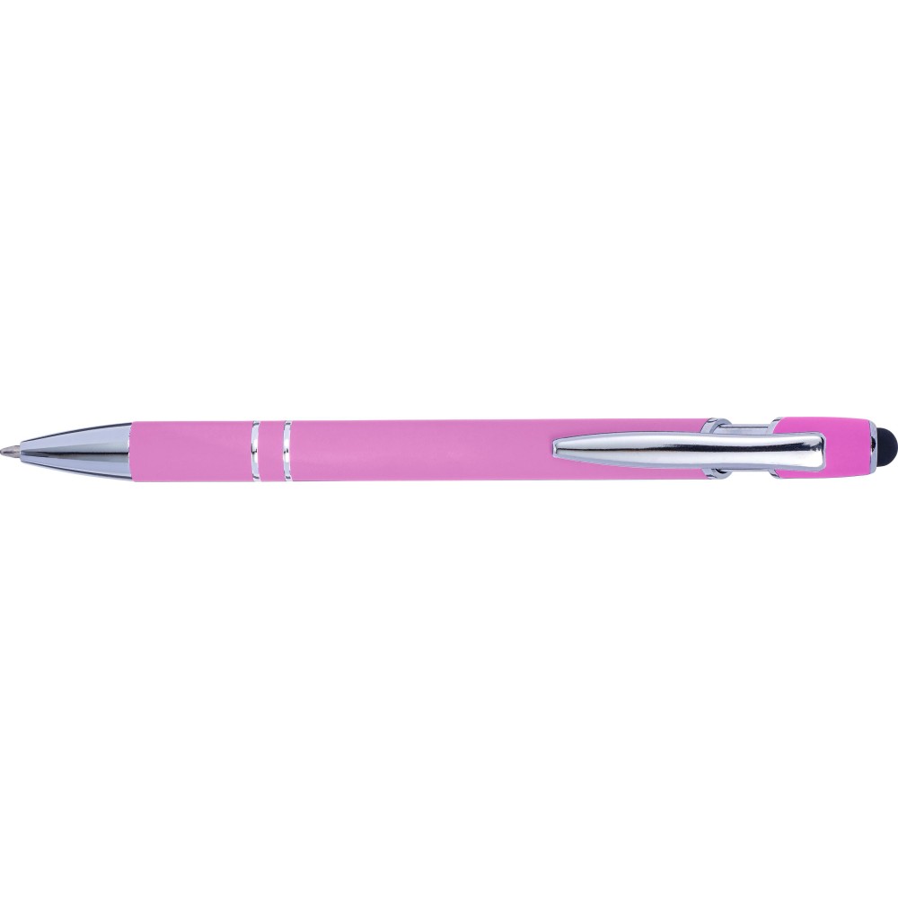 Golyóstoll kék tollbetéttel, gumis felülettel és érintővel kapacitív képernyőkhöz. Kék tollbetéttel. A hegy és a klipsz ezüst színű műanyag. ABS, alumínium. Emblémázás: Gravírozás, UV nyomtatás