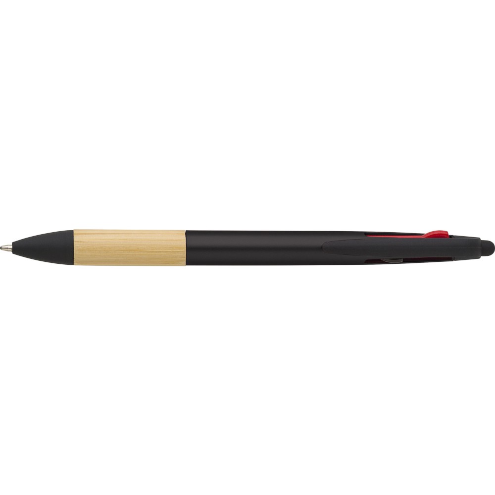 Golyóstoll 3 féle tollbetéttel, bambusz markolattal és tollheggyel. A tollbetét színei: piros, kék, fekete. ABS műanyag. Emblémázás: Tamponnyomás