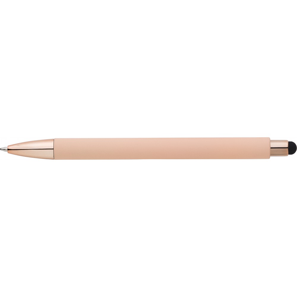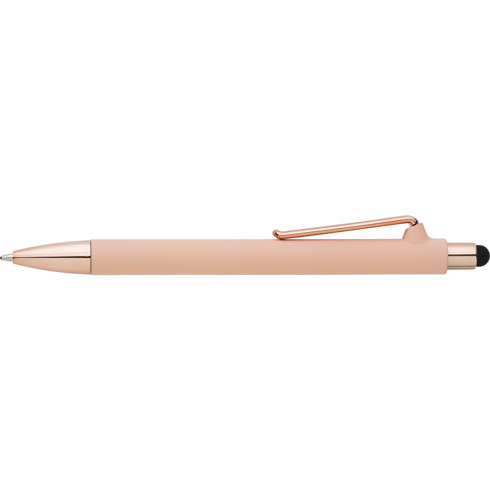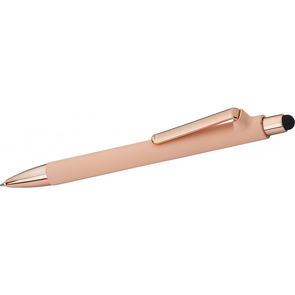 Golyóstoll gumis bevonattal és UV színű részletekkel, érintővel, kék tollbetéttel. ABS, PP műanyag, szilikon, vas. Emblémázás: UV nyomtatás