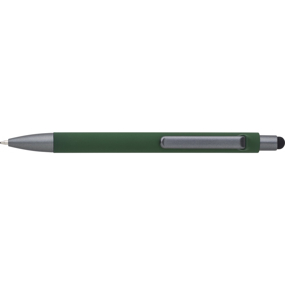 Golyóstoll gumis bevonattal, érintővel, kék tollbetéttel. ABS, PP műanyag, szilikon, vas. Emblémázás: UV nyomtatás
