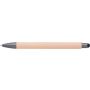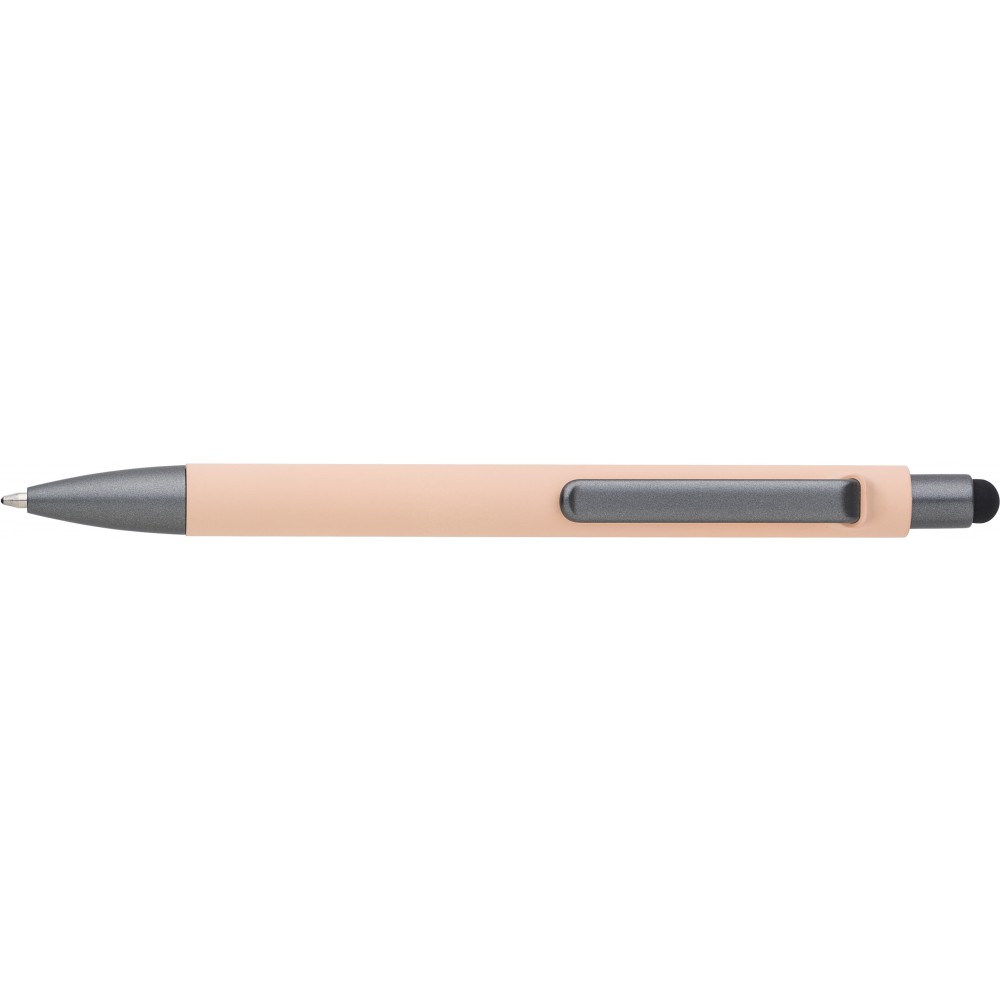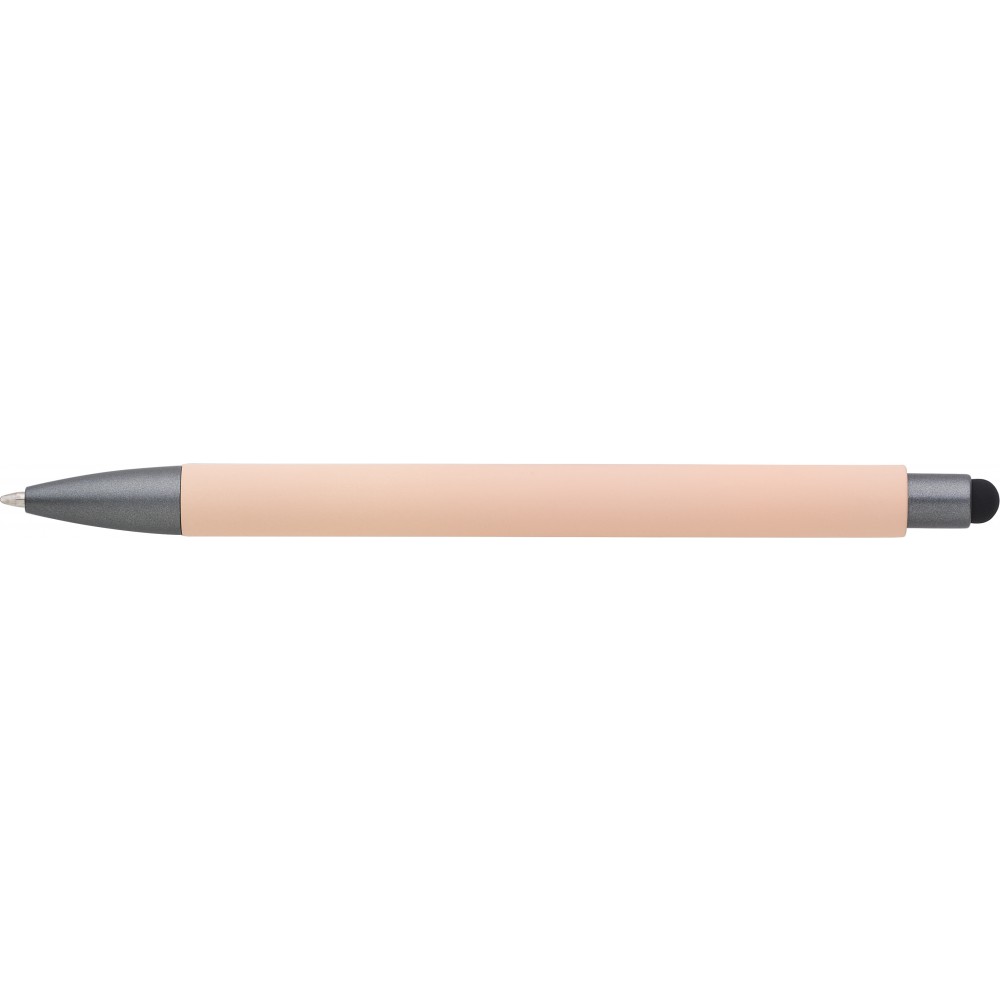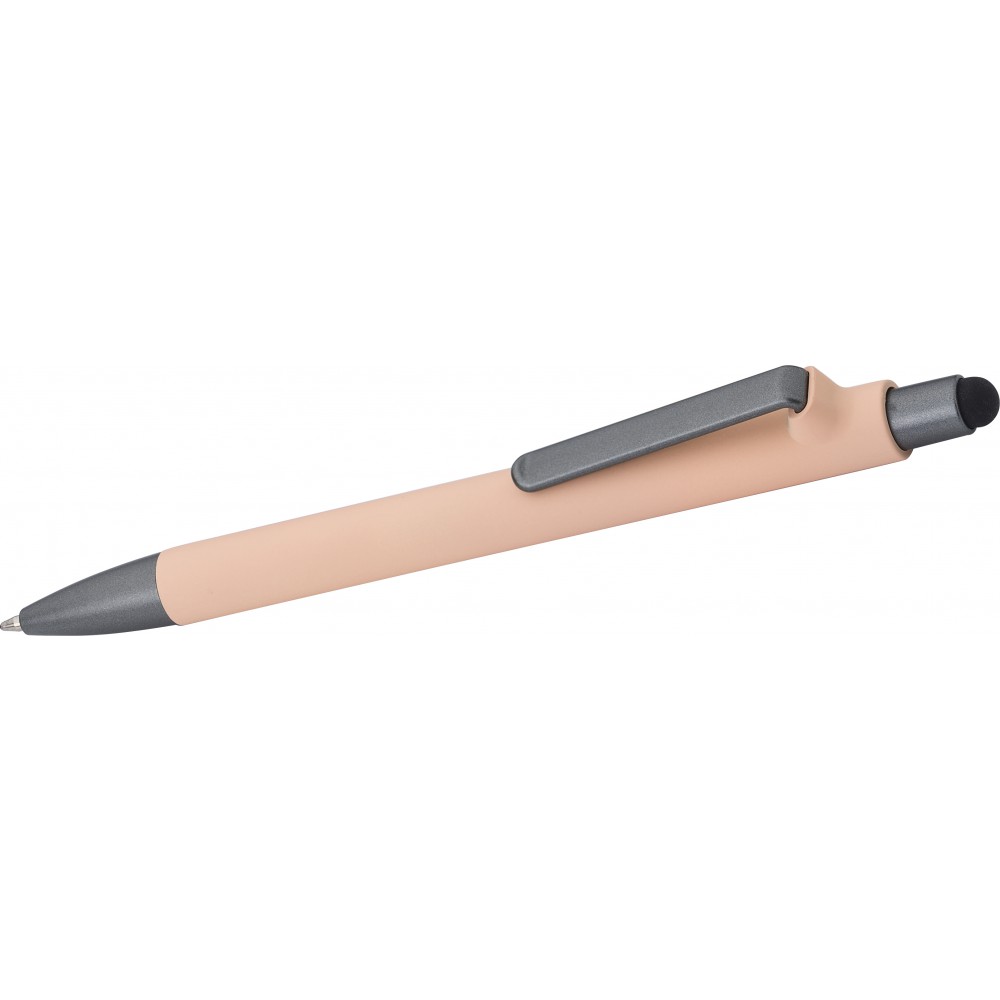 Golyóstoll gumis bevonattal, érintővel, kék tollbetéttel. ABS, PP műanyag, szilikon, vas. Emblémázás: UV nyomtatás