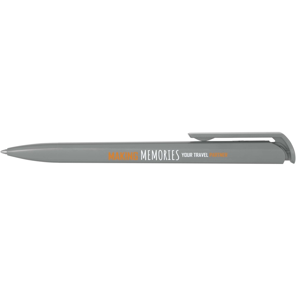 Golyóstoll, amelynek teste és klipsze újrahasznosított műanyagból készült, a hegy pedig rozsdamentes acélból. Fekete tollbetéttel. Íráshossz: 3000 méter. Hegyméret: 1,00 mm. Németországban készült. Emblémázás: Tamponnyomás