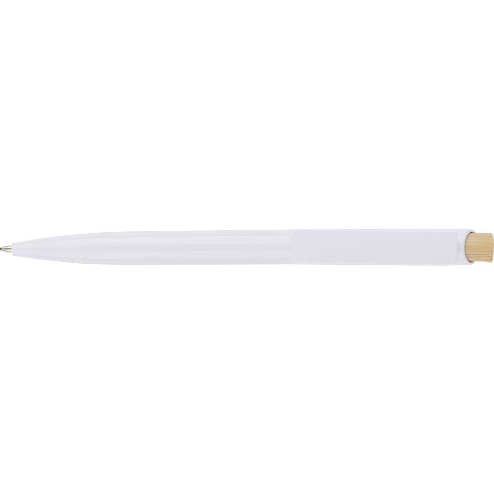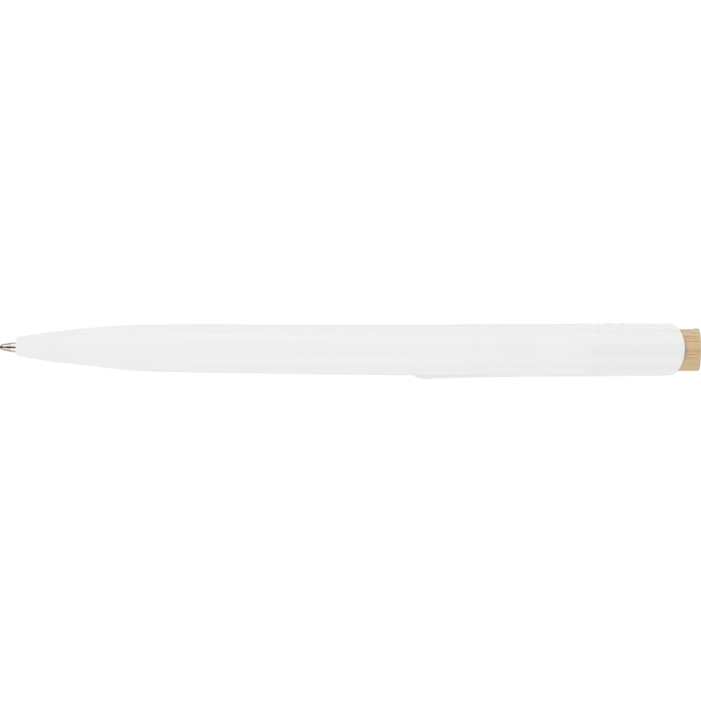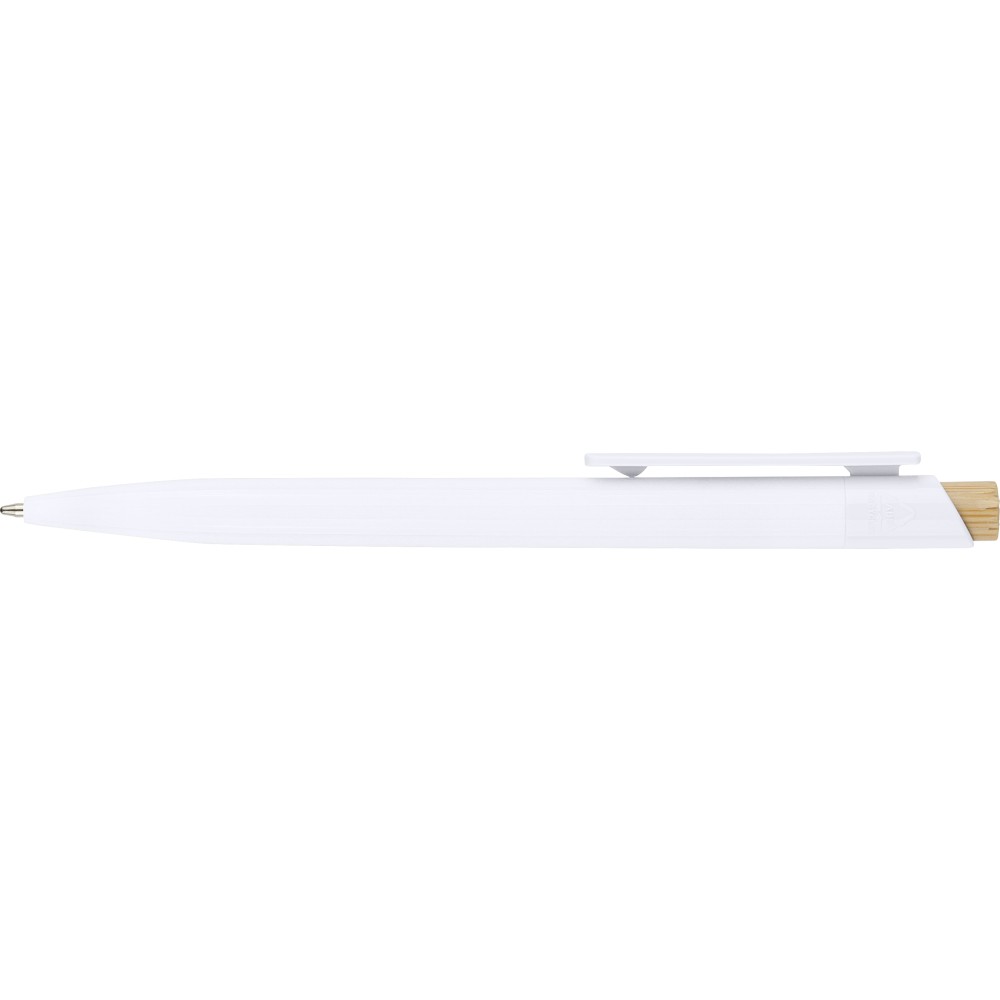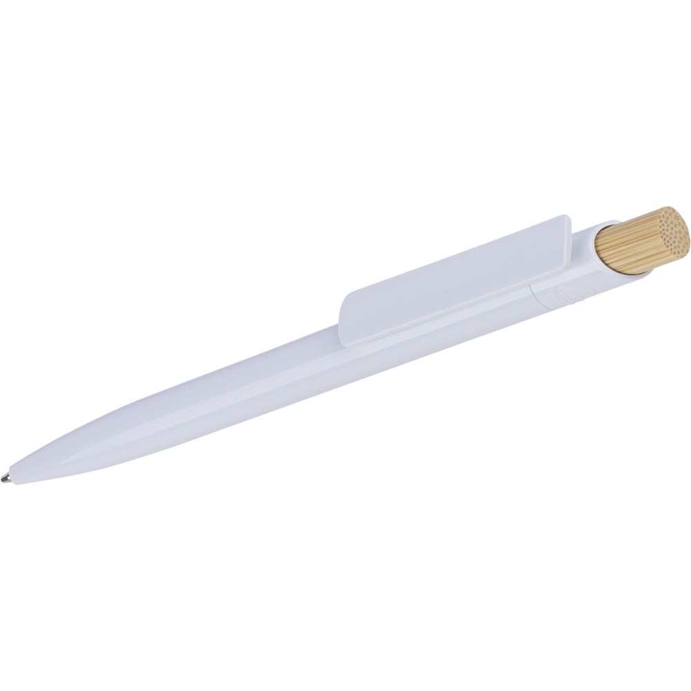Újrahasznosított ABS-ből készült golyóstoll bambusz nyomógombbal és fehér klippel, digitális nyomtatásra alkalmas kivitelben. A tolltesten fröccsöntés során elhelyezett recycled (újrahasznosított) alapanyagra utaló logó található. Megközelítőleg 600 méter íráshosszúságú, kék színű tollbetéttel. Emblémázás: Tamponnyomás