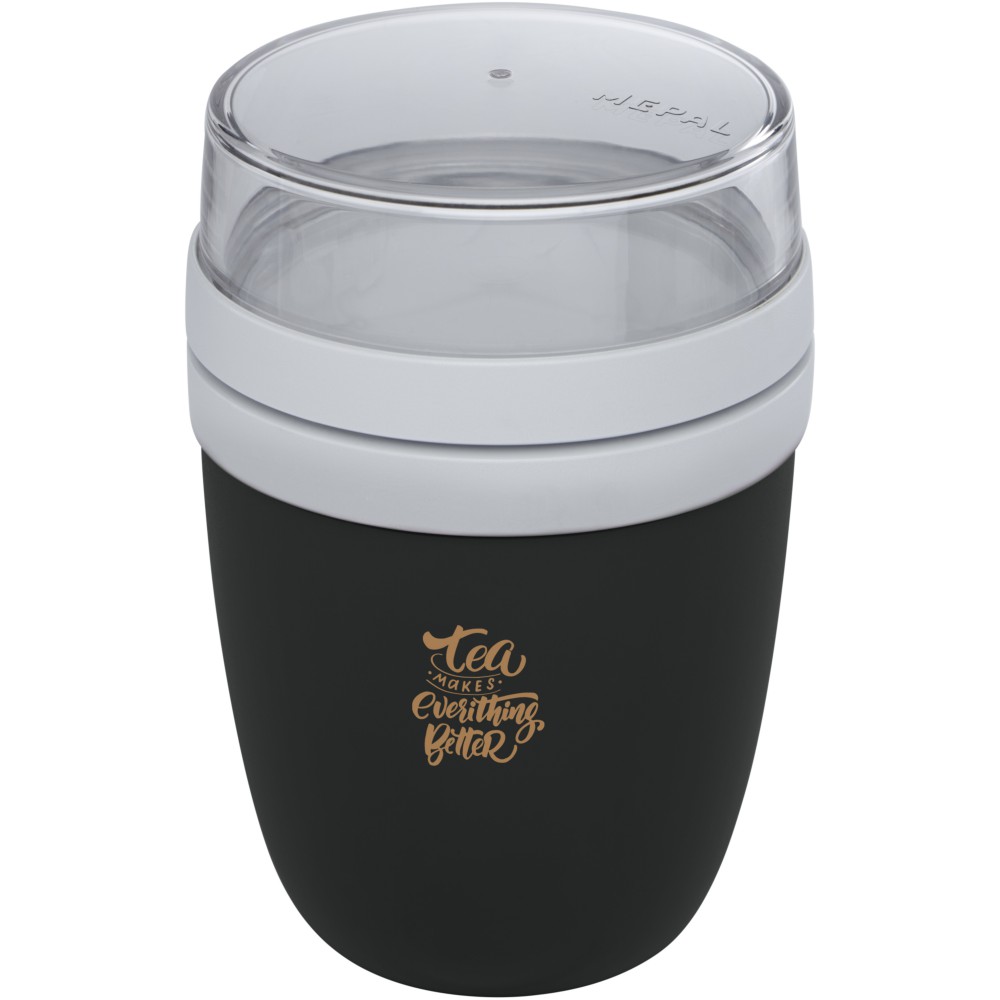 Ételtartó edény két rekesszel. Mindkét tartálynak külön fedele van. A felső, átlátszó rész űrtartalma 200 ml. Az alsó edény 500 ml-es. Fagyasztóba, mikrohullámú sütőbe (fedél nélkül), és mosogatógépbe tehető. A felső, átlátszó rész nem tehető mikrohullámú sütőbe. Szivárgásmentes. BPA mentes. PP műanyag, PCTG műanyag. Emblémázás: Tamponnyomás