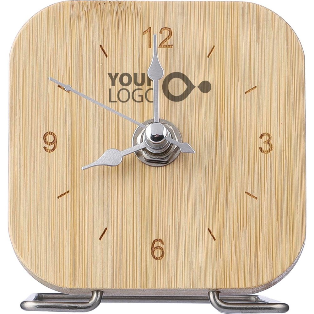 Bambusz óra ezüst mutatókkal és állvánnyal. Elem mellékelve. Egyenként barna kartondobozba csomagolva. Emblémázás: Tamponnyomás