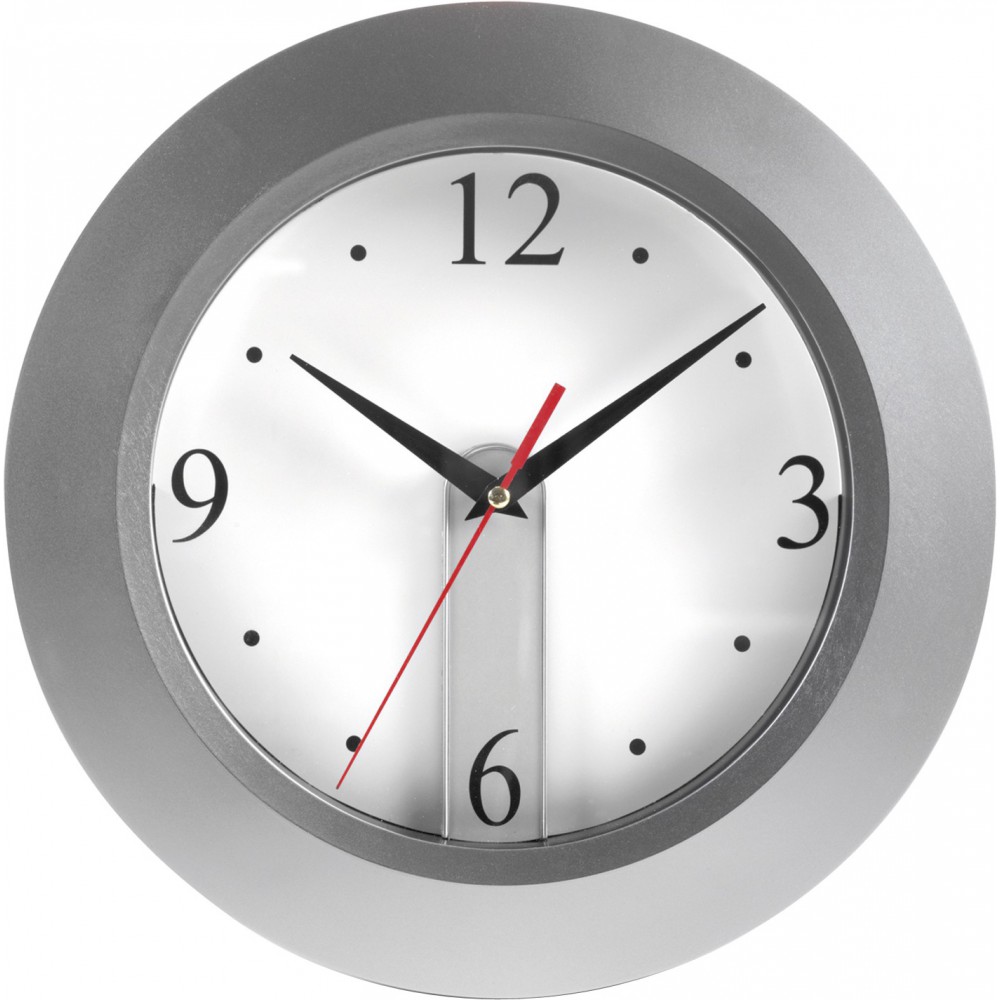Falióra kivehető számlappal, ezüstszínű műanyag kerettel. Az elemet tartalmazza. Emblémázás: Tamponnyomás, UV nyomtatás