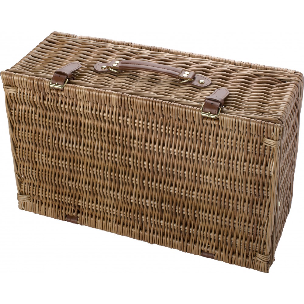Piknikkosár 4 fő részére. Rozsdamentes acél evőszközök műanyag nyéllel, 4 darab kerámia tányér és 4 darab 0,21 literes kerámia bögre. A termék természetes anyagokból készült, ezért méreteiben eltérések adódhatnak. Emblémázás: Bögredekor