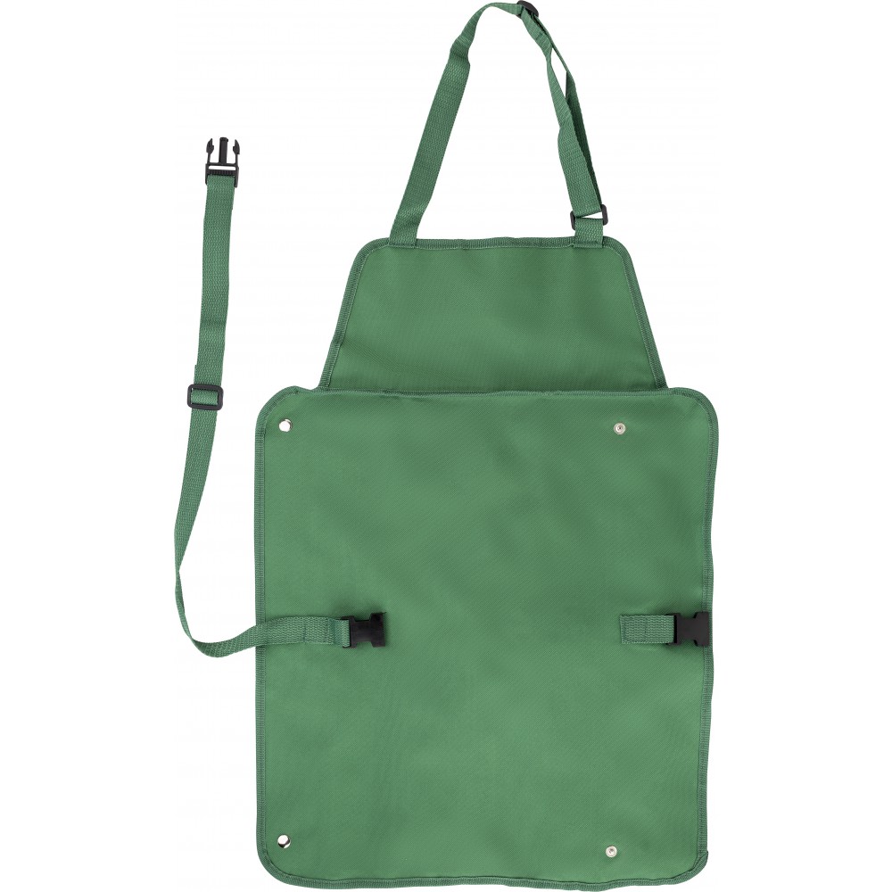 Barbecue kötény. A zsebek tartalma: hússütő villa, kés, fogó, lapát, só- és borsszóró, edényfogó kesztyű. Emblémázás: Szitanyomás