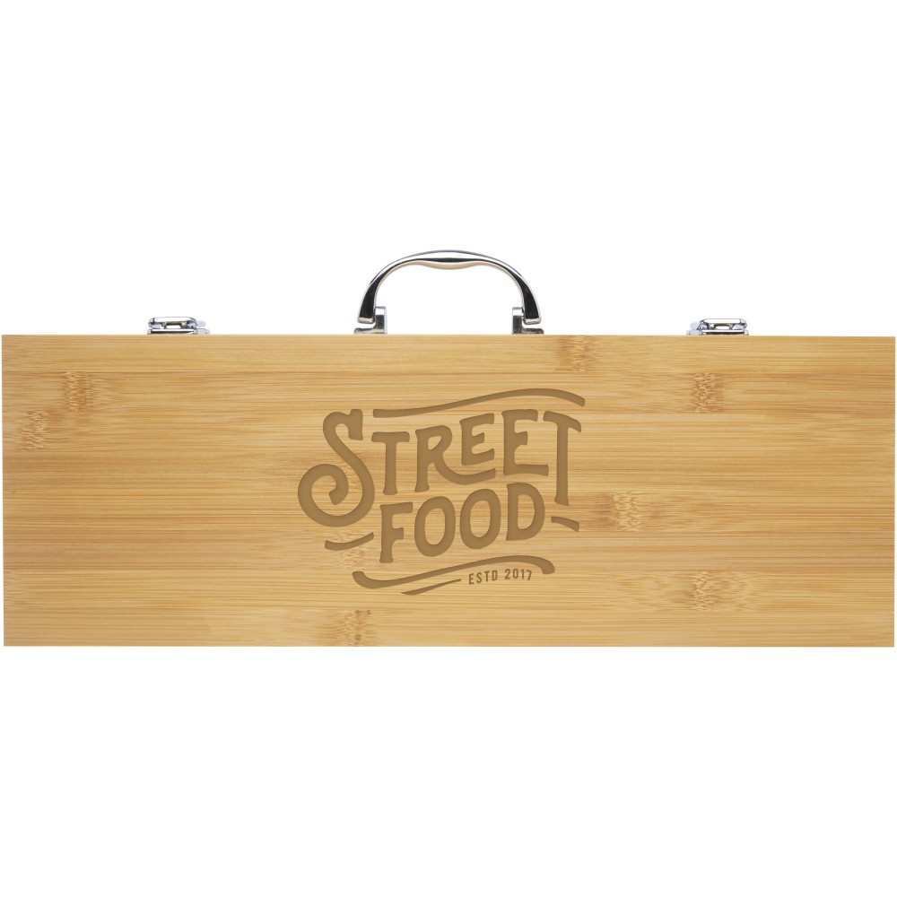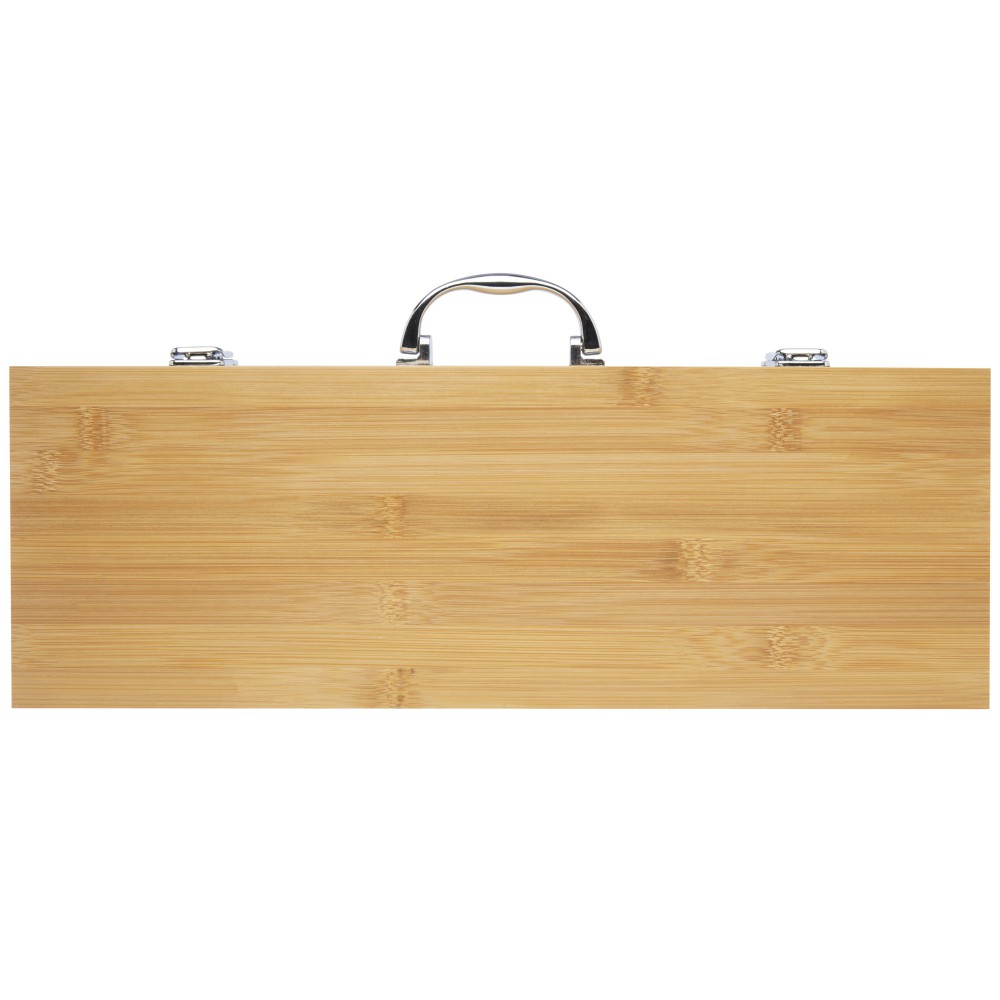 5 részes bambusz BBQ készlet lapáttal (40 x 9,5 cm), fogóval (34,5 x 6 cm), villával (38,5 x 3 cm), késsel (38,5 x 3 cm) és kefével (38 x 4,3 cm). A készletet bambusz díszdobozban (46 x 16,2 x 7,4 cm) szállítjuk. A fogantyúk és az ajándékdoboz bambuszból készülnek, amelyet a fenntartható szabványok szerint szereztek be és gyártottak. Emblémázás: Gravírozás, Tamponnyomás