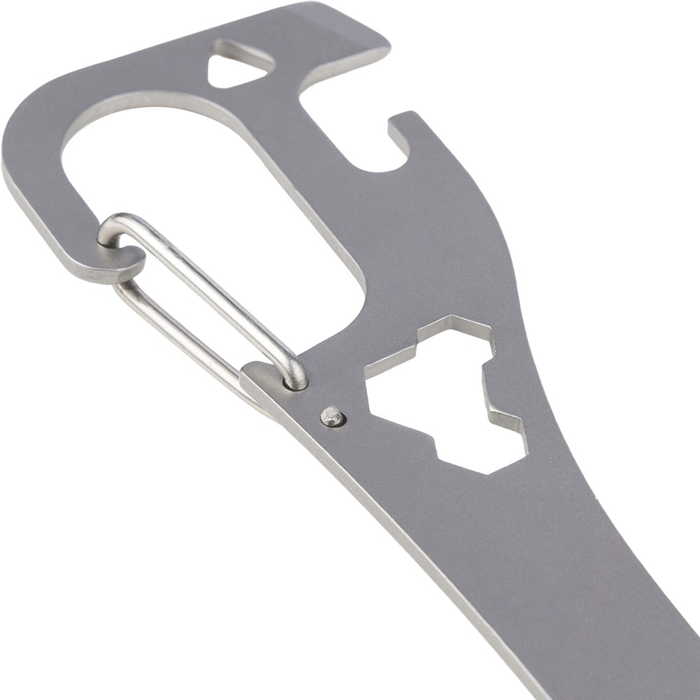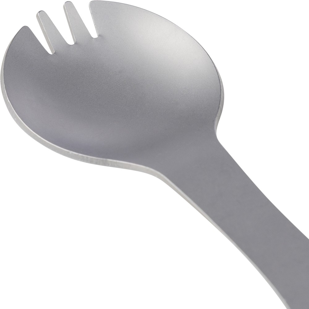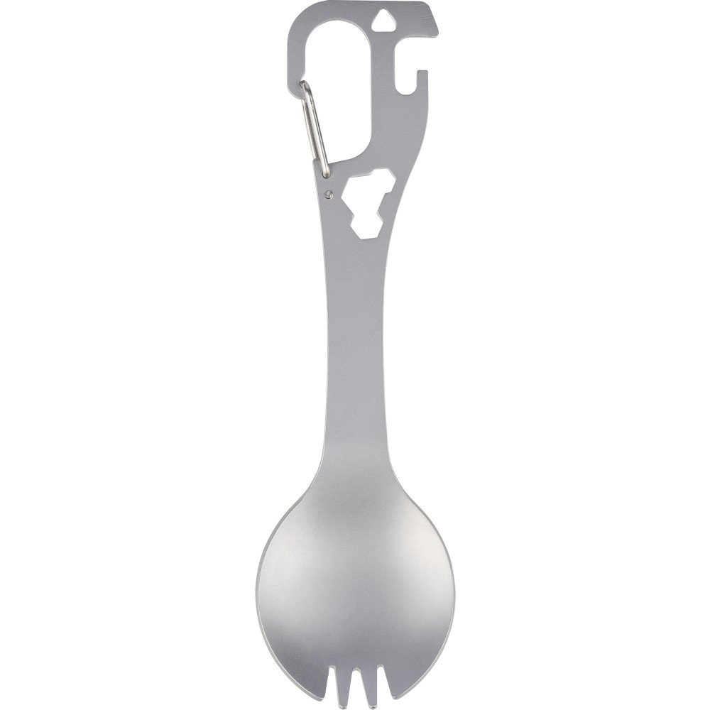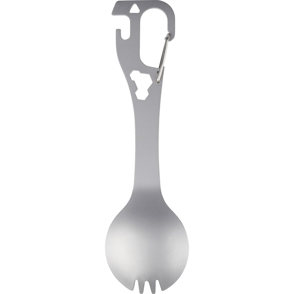 Rozsdamentes acélból készült spork (kanál - villa kombináció) integrált villával és kanállal, valamint beépített lapos csavarhúzóval, üveg- és konzervnyitóval, továbbá három hatlapú kulccsal a nyélben. Karabinerrel ellátva. Darabonként papírtasakba csomagolva. Emblémázás: Gravírozás