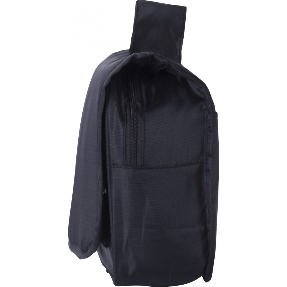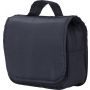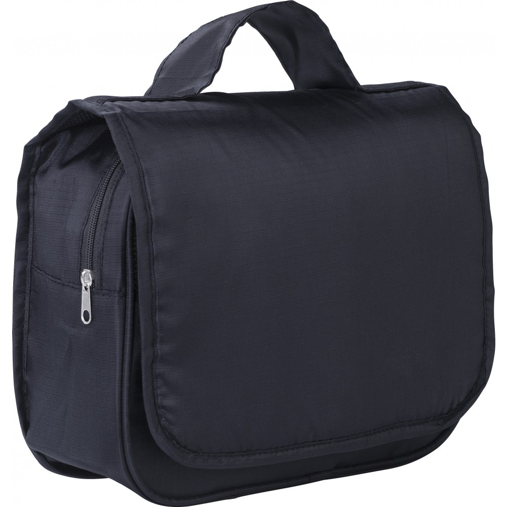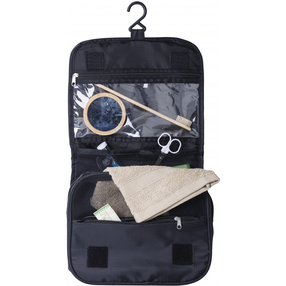 Piperetáska akasztóval. Kinyitva felül átlátszó zseb. Belül egy nagy cipzáras hálós zseb és egy kis zárt cipzáras zseb található. Hátoldalán egy rekesz. Rövid fogantyú. Ripstop 210D. Emblémázás: Szitanyomás