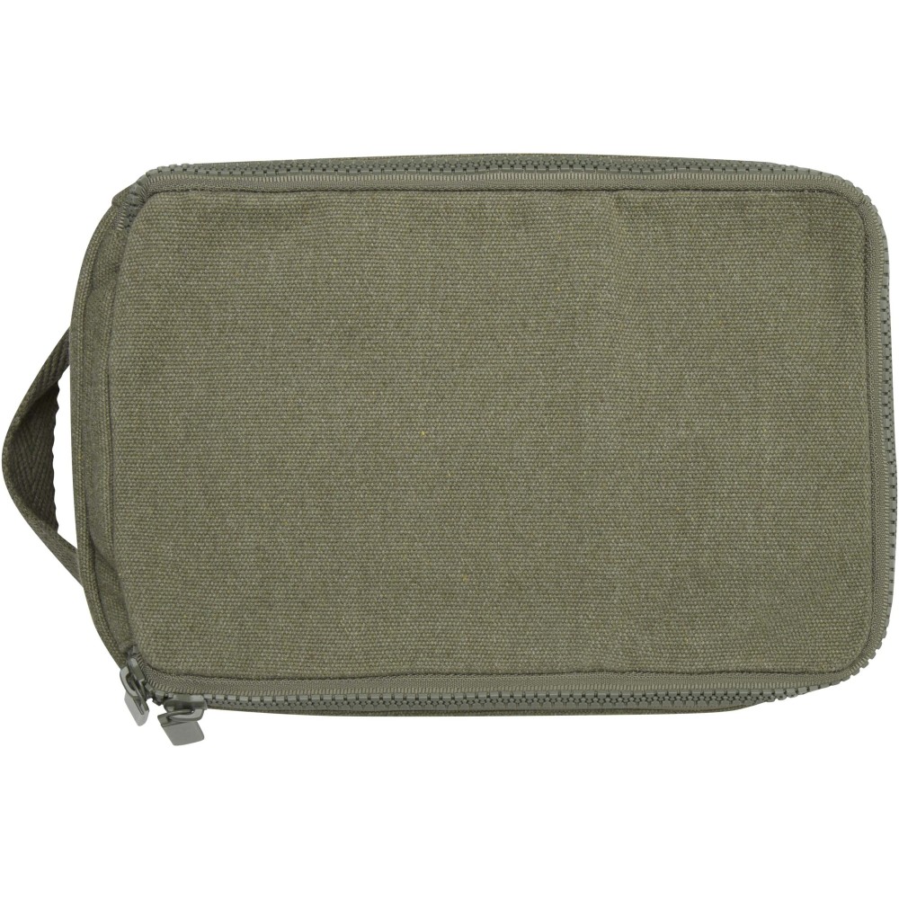 Piperetáska 500 g/m2 újrahasznosított pamutból és poliészterből, tágas fő rekesszel, biztonságos cipzáras záródással és több belső zsebbel, amely ideális piperecikkek tárolására. Sokoldalú kialakításának köszönhetően kisebb tárgyak - például zoknik vagy töltők - rendszerezésére is kiváló, így a csomagok rendezetten tarthatók. A táska Cyclo újrahasznosított szálakat tartalmaz, amelyek előválogatott hulladékból készülnek, és ennek megfelelően alakul a fonal színe is. Ezek a szálak nemcsak a primer nyersanyagok iránti igényt csökkentik, hanem elköteleződést is mutatnak a körforgásos szemlélet iránt, elősegítve a hulladékcsökkentést és a zárt rendszerű gyártást. Minden táskához tartozik egy Aware nyomkövető is, amelynek QR-kódja révén nyomon követhető a termék eredete és útja, ezáltal fokozva az ellátási lánc átláthatóságát, és erősebb kapcsolatot teremtve a felhasználó és a termék gyártási folyamata között. Emblémázás: Szitanyomás