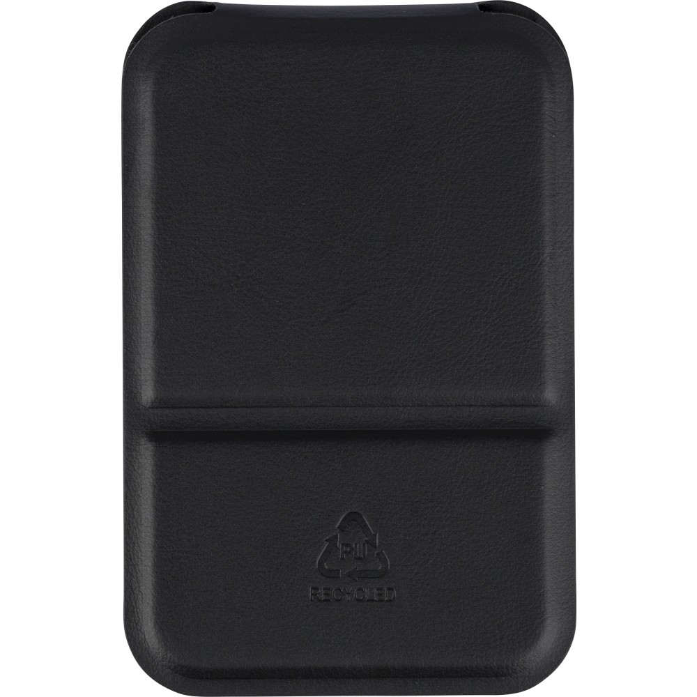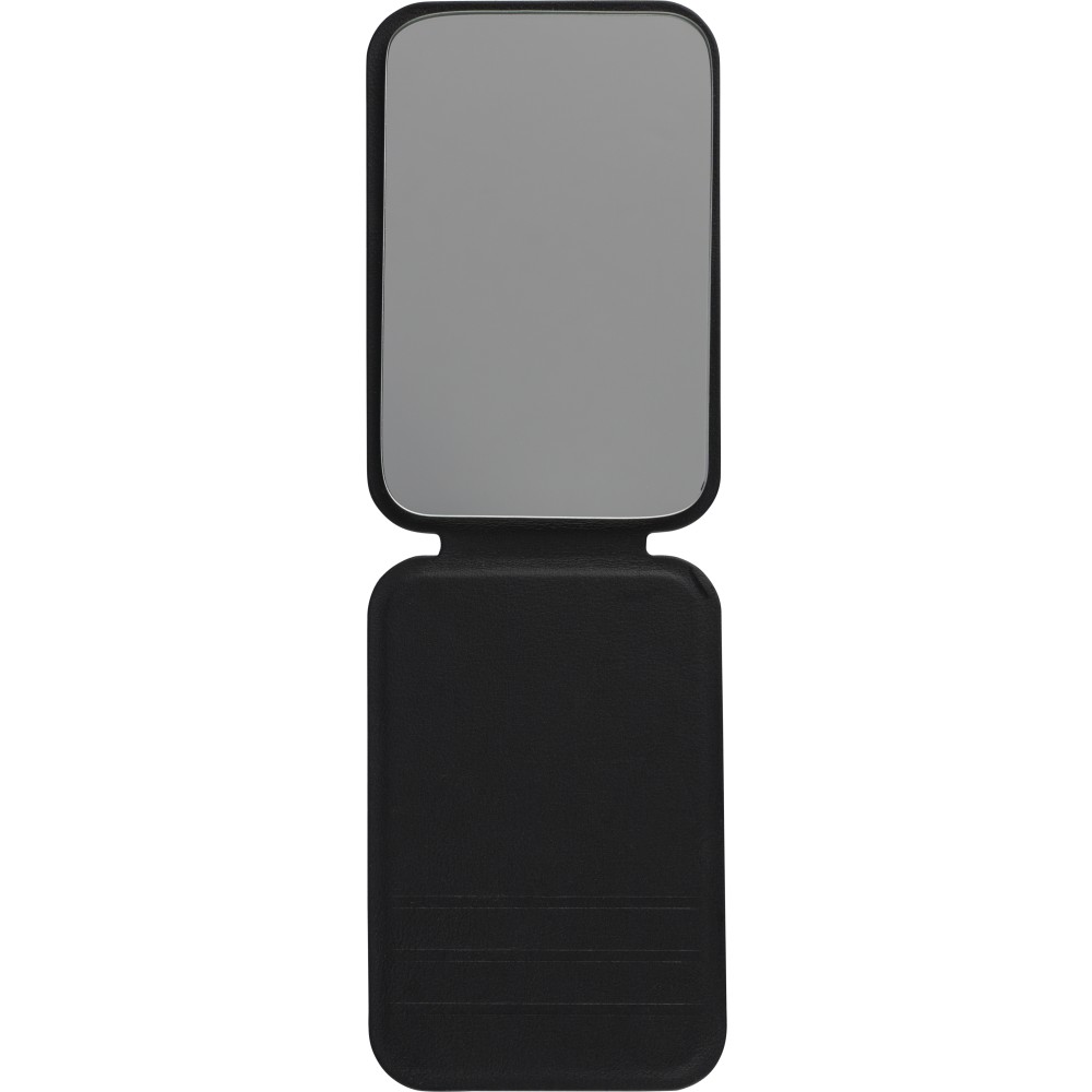 Üvegtükör összehajtható, újrahasznosított PU borítással, amely kinyitva álló helyzetben használható. A borításon dombornyomott, újrahasznosított alapanyagra utaló logó található. Papírtasakba csomagolva. Emblémázás: Tamponnyomás,