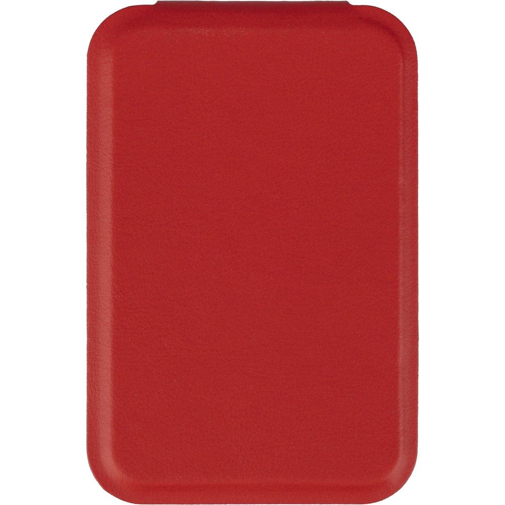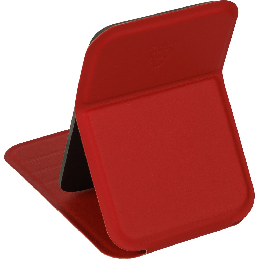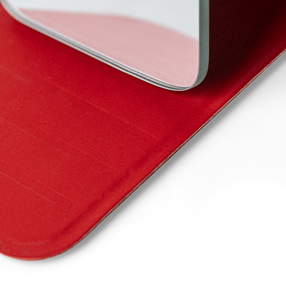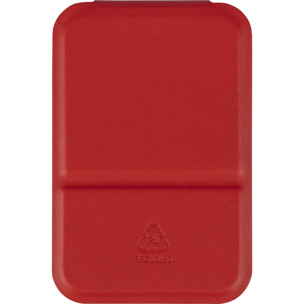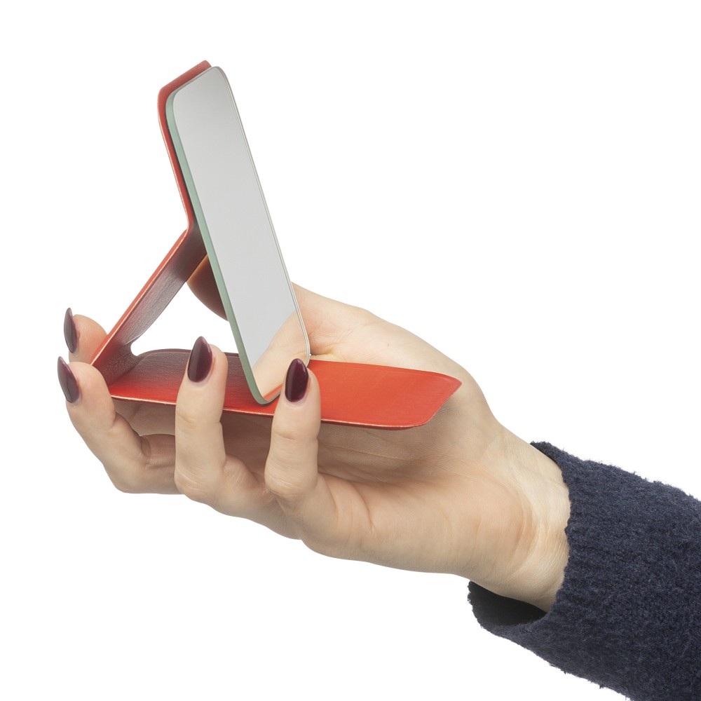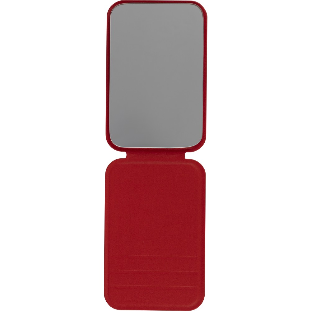 Üvegtükör összehajtható, újrahasznosított PU borítással, amely kinyitva álló helyzetben használható. A borításon dombornyomott, újrahasznosított alapanyagra utaló logó található. Papírtasakba csomagolva. Emblémázás: Tamponnyomás,