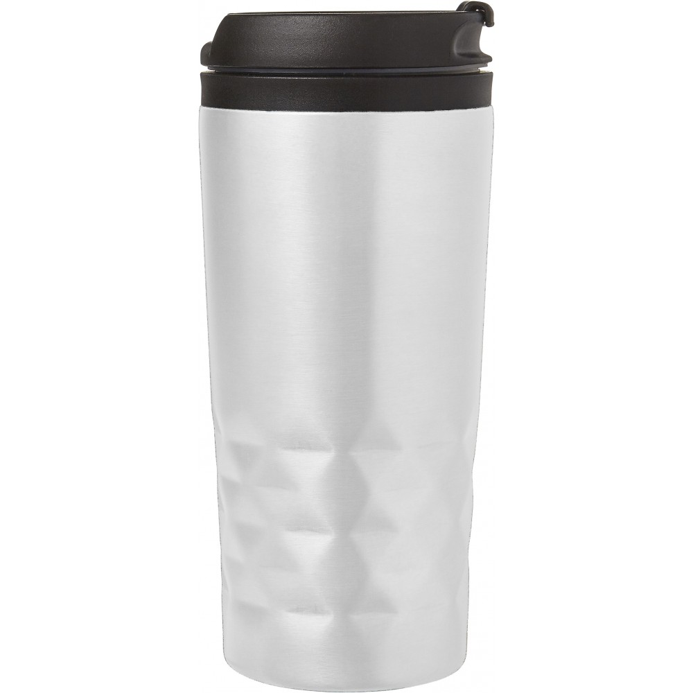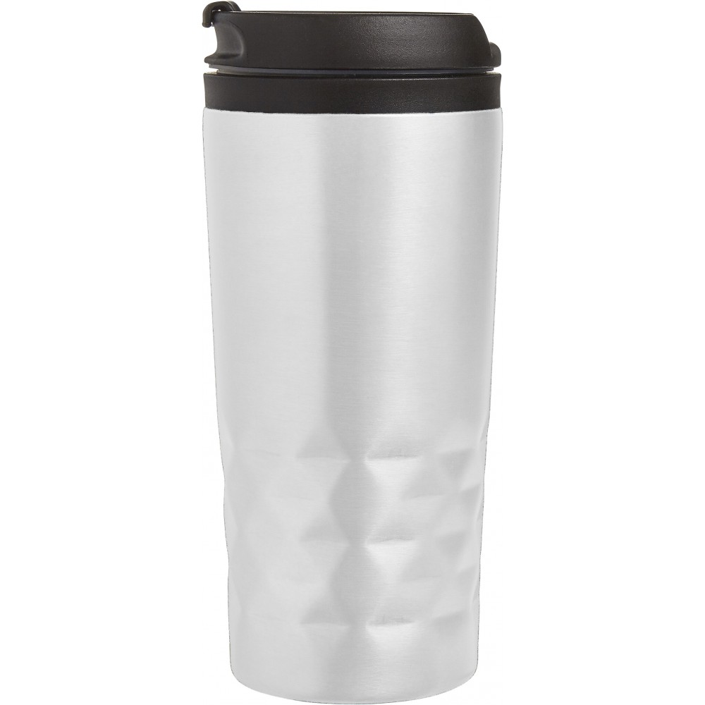 Duplafalú fedeles pohár. 300 ml. Rozsdamentes acél és BPA-mentes műanyag. Nem szivárgásmentes és nem mosogatógépálló termék. Emblémázás: Gravírozás, Körszita, Tamponnyomás