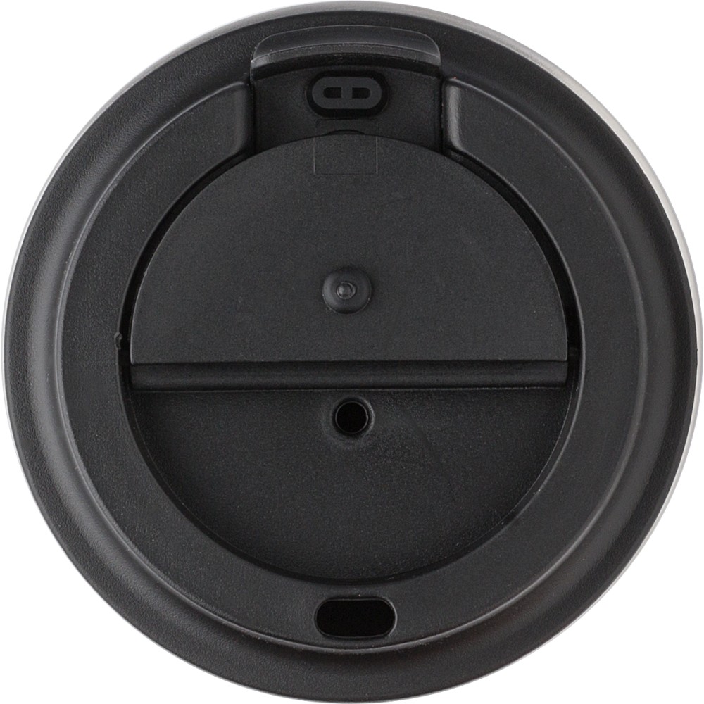 Rozsdamentes acélból és PP-ből készült utazópohár (350 ml). A PP fedél szilikon zárógyűrűvel rendelkezik, tetején lehajtható záróelemmel. Egyedileg csomagolva barna kartondobozban érkezik. Emblémázás: Tamponnyomás