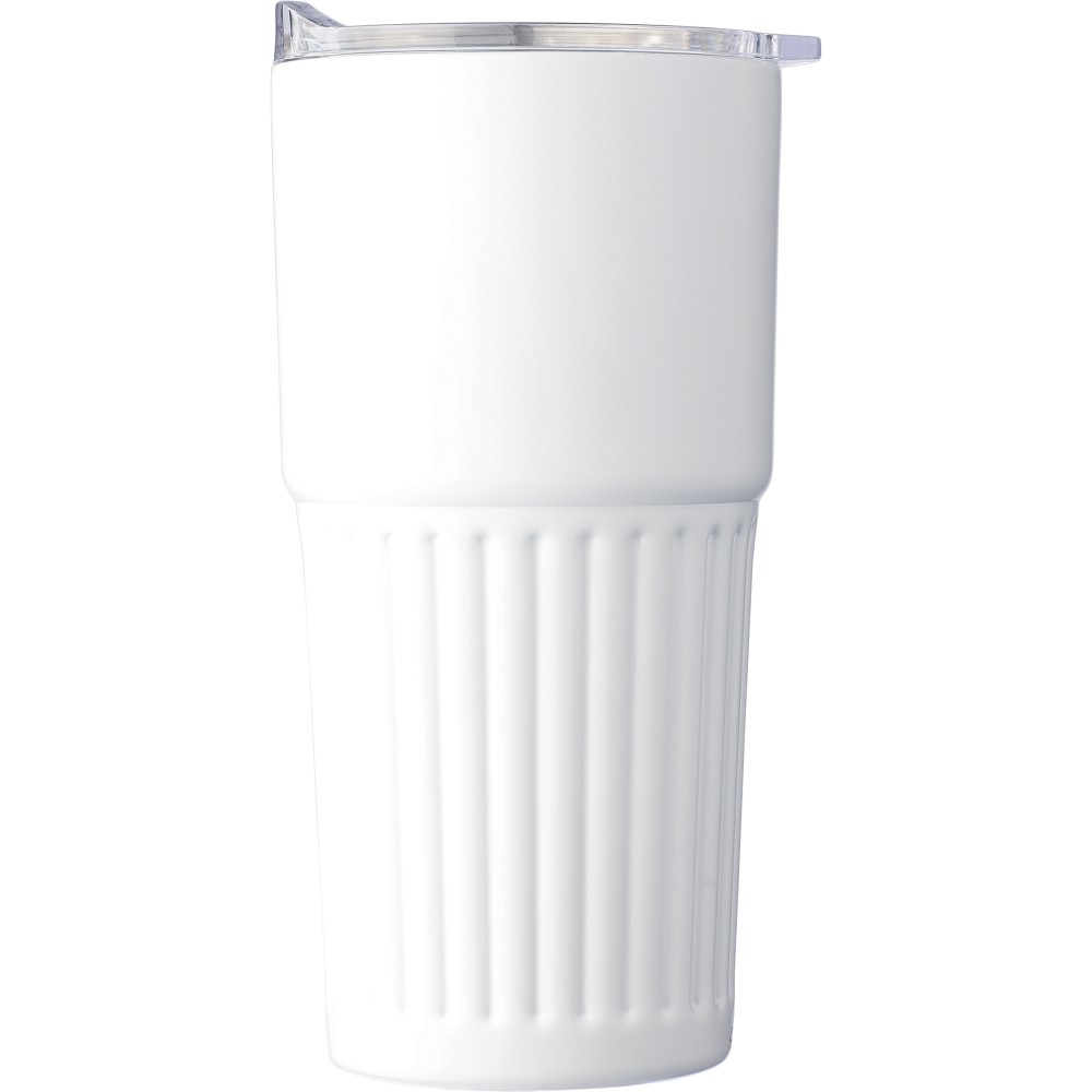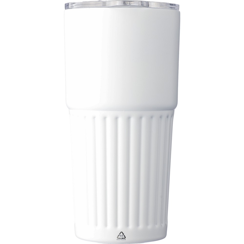 Újrahasznosított rozsdamentes acél útibögre, 450 ml. A belső 304-es, a külső 201-es rozsdamentes acélból készült, bordás markolattal, műanyag, csúszózáras fedéllel. Gravírozott újrahasznosított logó található a bögrén. Csomagolása barna papírdoboz. Emblémázás: Körszita, Tamponnyomás