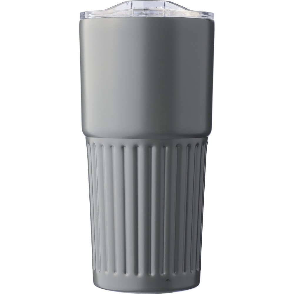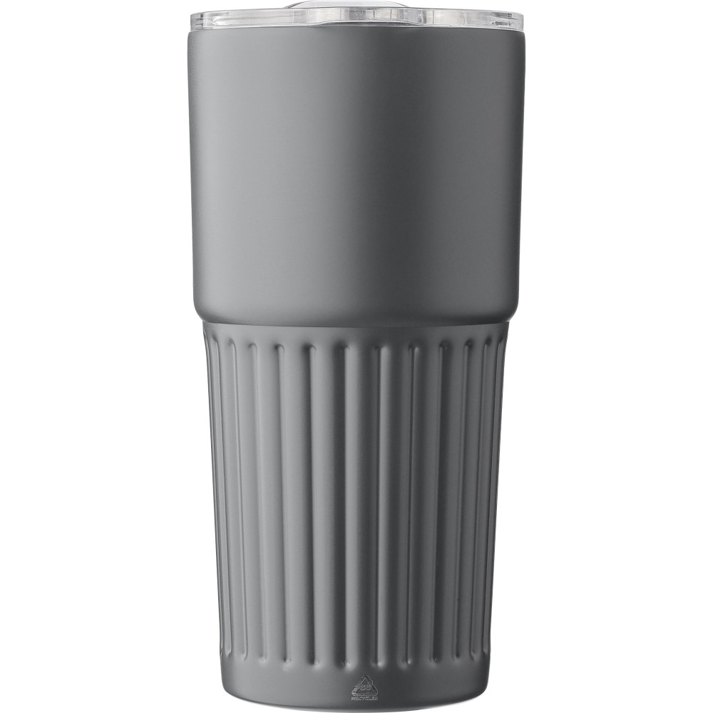 Újrahasznosított rozsdamentes acél útibögre, 450 ml. A belső 304-es, a külső 201-es rozsdamentes acélból készült, bordás markolattal, műanyag, csúszózáras fedéllel. Gravírozott újrahasznosított logó található a bögrén. Csomagolása barna papírdoboz. Emblémázás: Körszita, Tamponnyomás