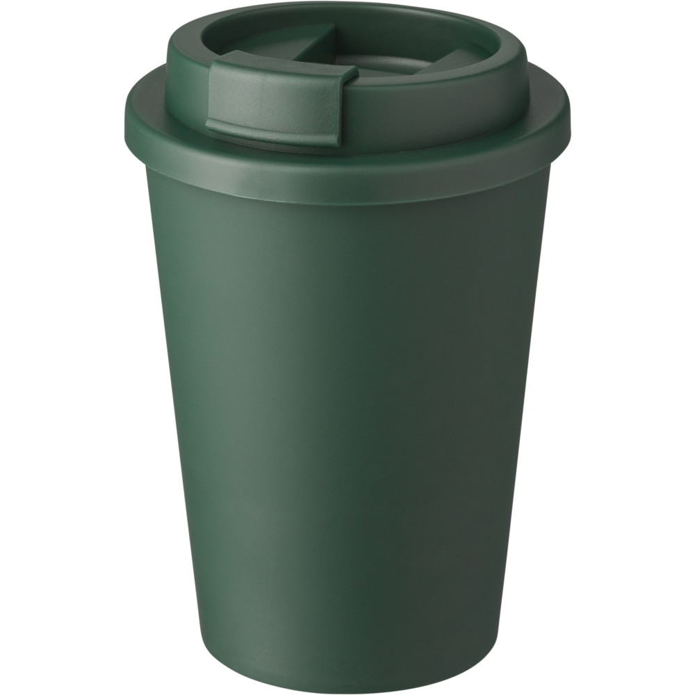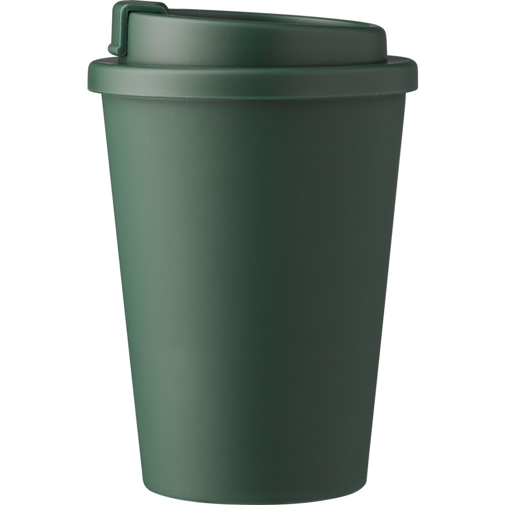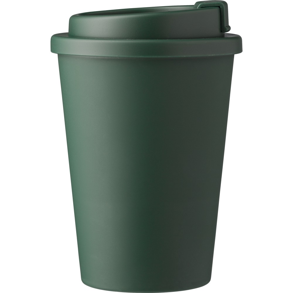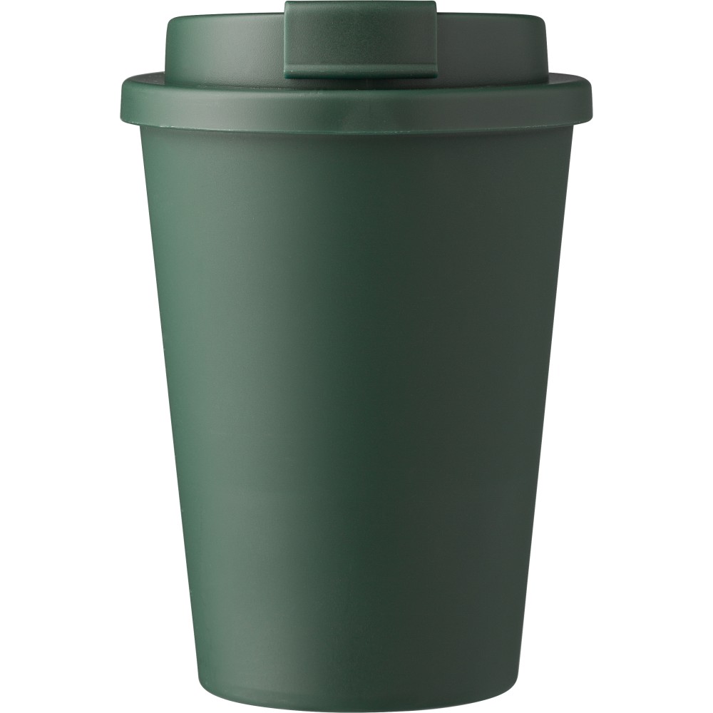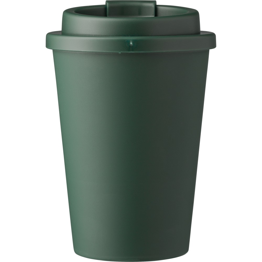 Kávéspohár csavaros fedéllel és felpattintható ivórésszel. Jó hőtartó, hideg és meleg italokhoz is használható. Űrtartalom: 350 ml. PP műanyag. Emblémázás: Körszita, Tamponnyomás