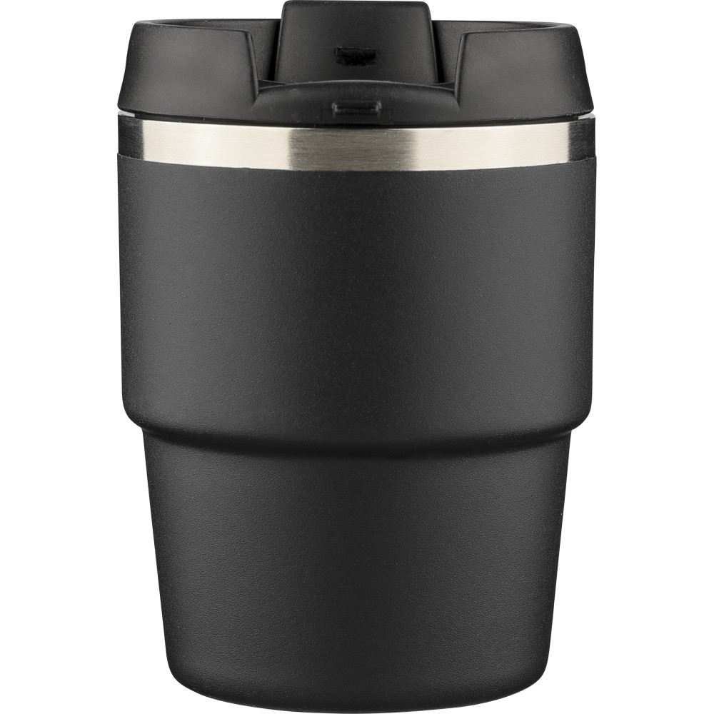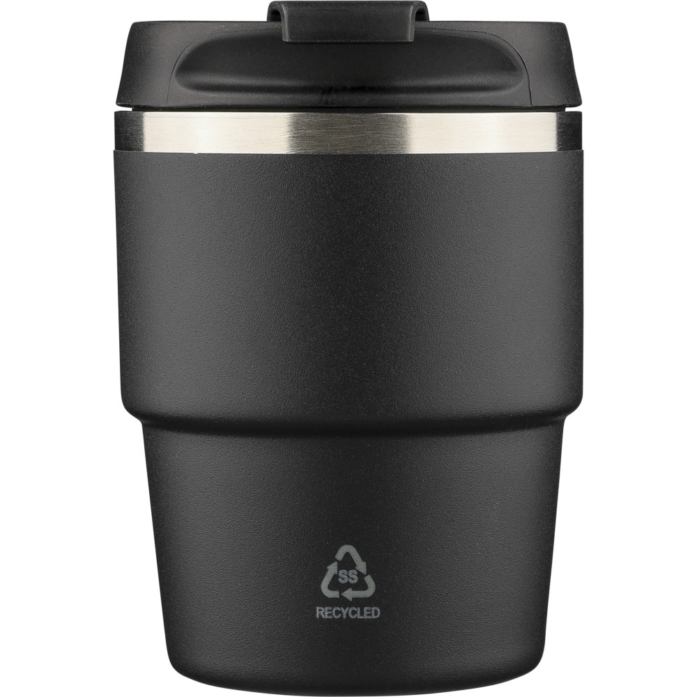 Újrahasznosított rozsdamentes acélból készült, vákuumszigetelésű bögre (175 ml) duplafalú kialakítással és porfestett felülettel, PP csavaros fedéllel. A pohártesten lézergravírozott recycled (újrahasznosított) alapanyagra utaló logó található. Kompakt kialakítása miatt a legtöbb kávégépbe illeszkedik, darabonként barna kartondobozba csomagolva szállítjuk. Emblémázás: Bögredekor