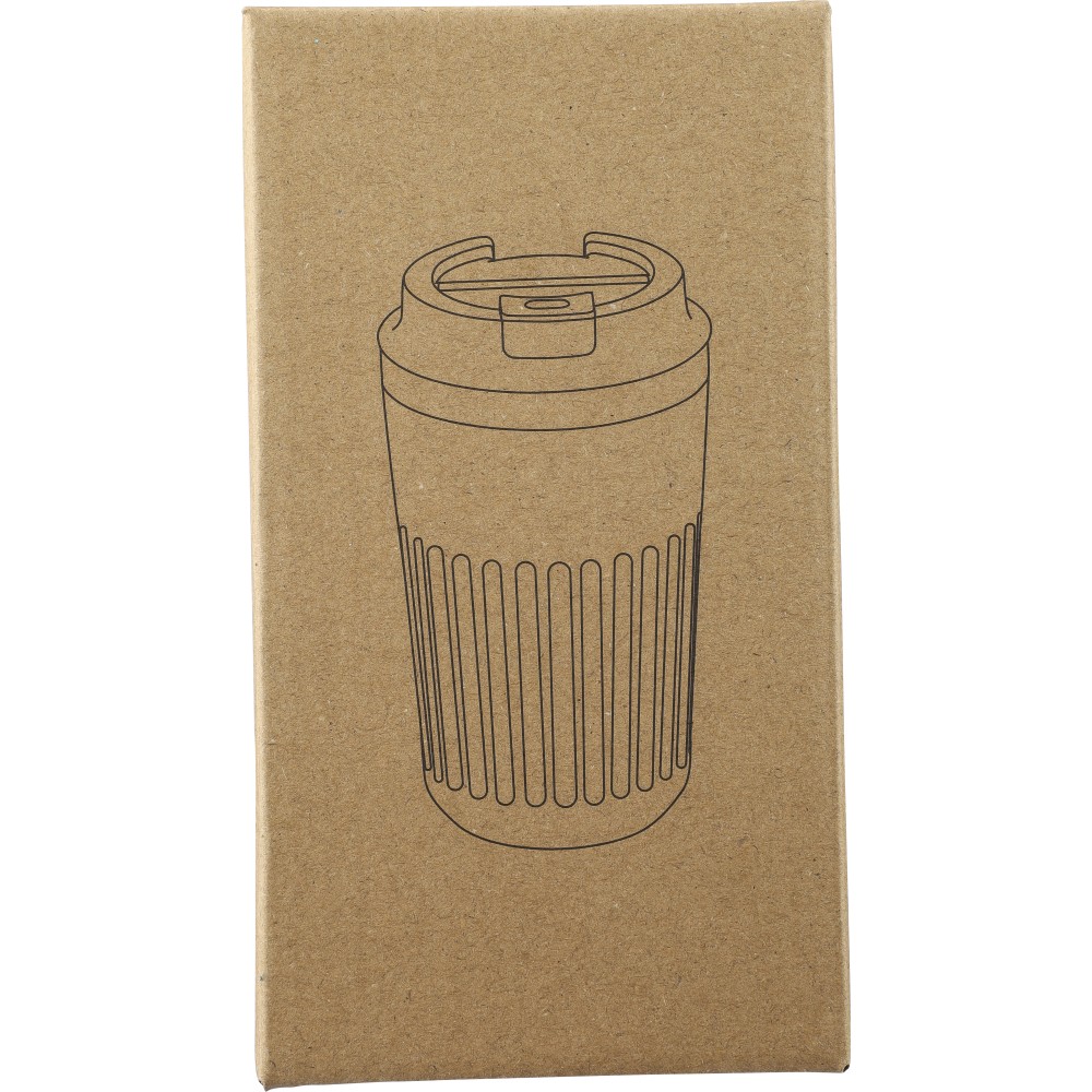 Újrahasznosított rozsdamentes acélból készült utazópohár 400 ml űrtartalommal, duplafalú kialakítással és külső bordázott felülettel. Belső része 304-es, külső része 201-es rozsdamentes acél, PP fedéllel. A pohártesten gravírozott recycled (újrahasznosított) alapanyagra utaló logó található. Darabonként barna kartondobozba csomagolva. Emblémázás: Gravírozás, Tamponnyomás