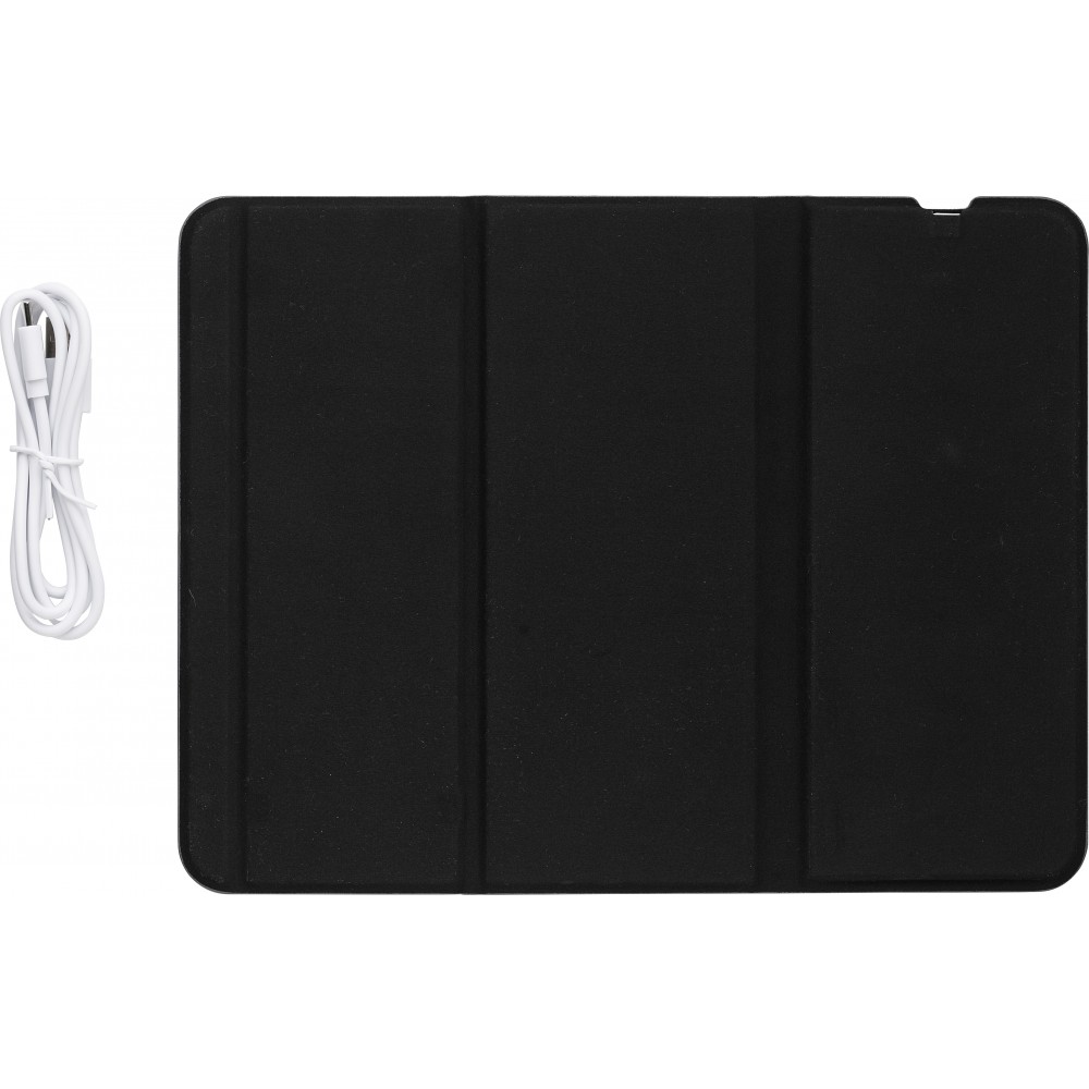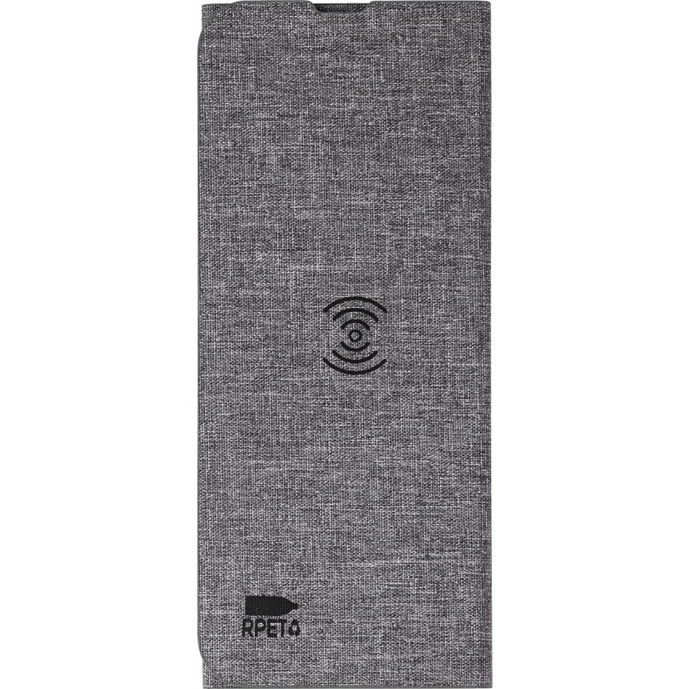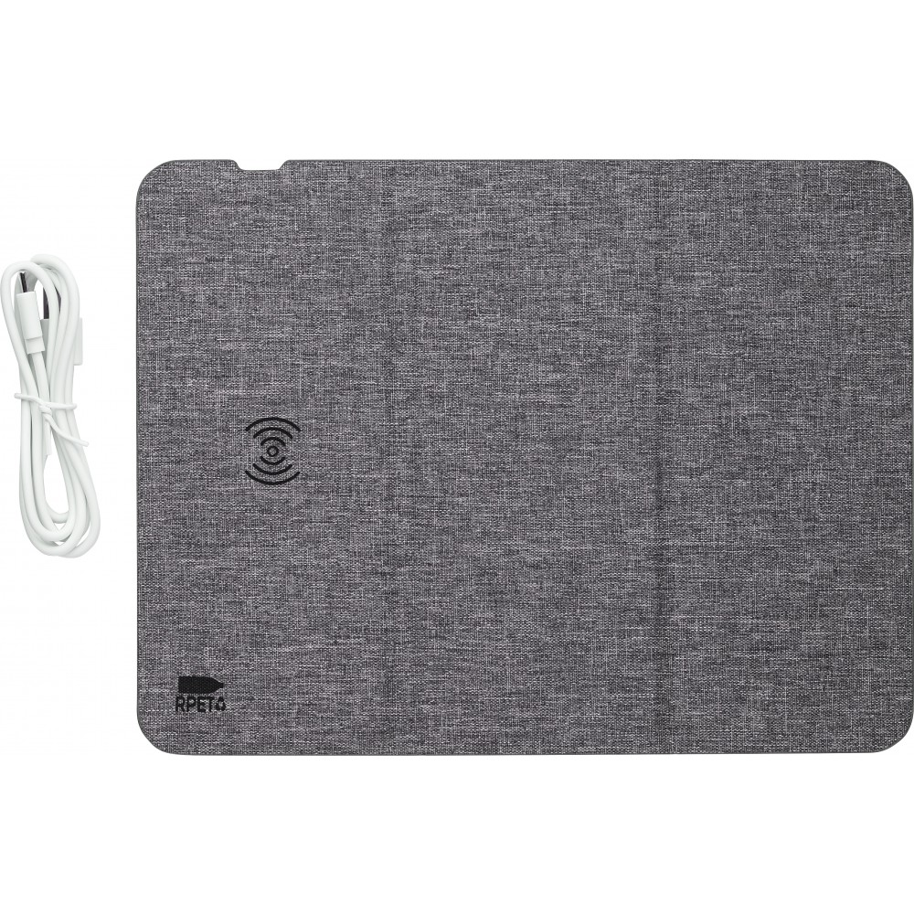 10 W-os vezeték nélküli gyorstöltő és egéralátét RPET szövet borítással. Töltéshez telefonállvánnyá is összehajtható. Lapos állapotban töltőként és egéralátétként is használható. Darabonként barna kartondobozba csomagolva érkezik. Az RPET anyagra utaló, nyomtatott logó gyárilag látható az egéralátéten. Emblémázás: Szitanyomás