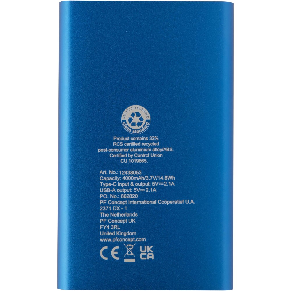 Pep Type-C újrahasznosított alumínium powerbank, 4000 mAh, kék
