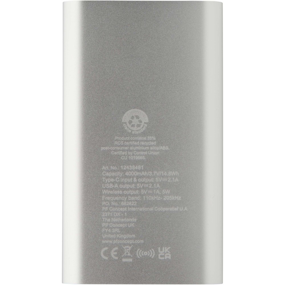Powerbank Type-C bemeneti/kimeneti porttal és USB-A porttal, amely lehetővé teszi két eszköz egyidejű töltését. Támogatja az 5W vezeték nélküli töltést minden Qi-kompatibilis eszköz számára. A powerbank 4000 mAh kapacitású lítium-polimer akkumulátorral rendelkezik, amely max. 10W teljesítményt biztosít. A powerbank 28%-ban RCS tanúsítvánnyal rendelkező újrahasznosított műanyagból készült. TPE Type-C - USB-A töltőkábellel szállítjuk. Emblémázás: Gravírozás, Tamponnyomás
