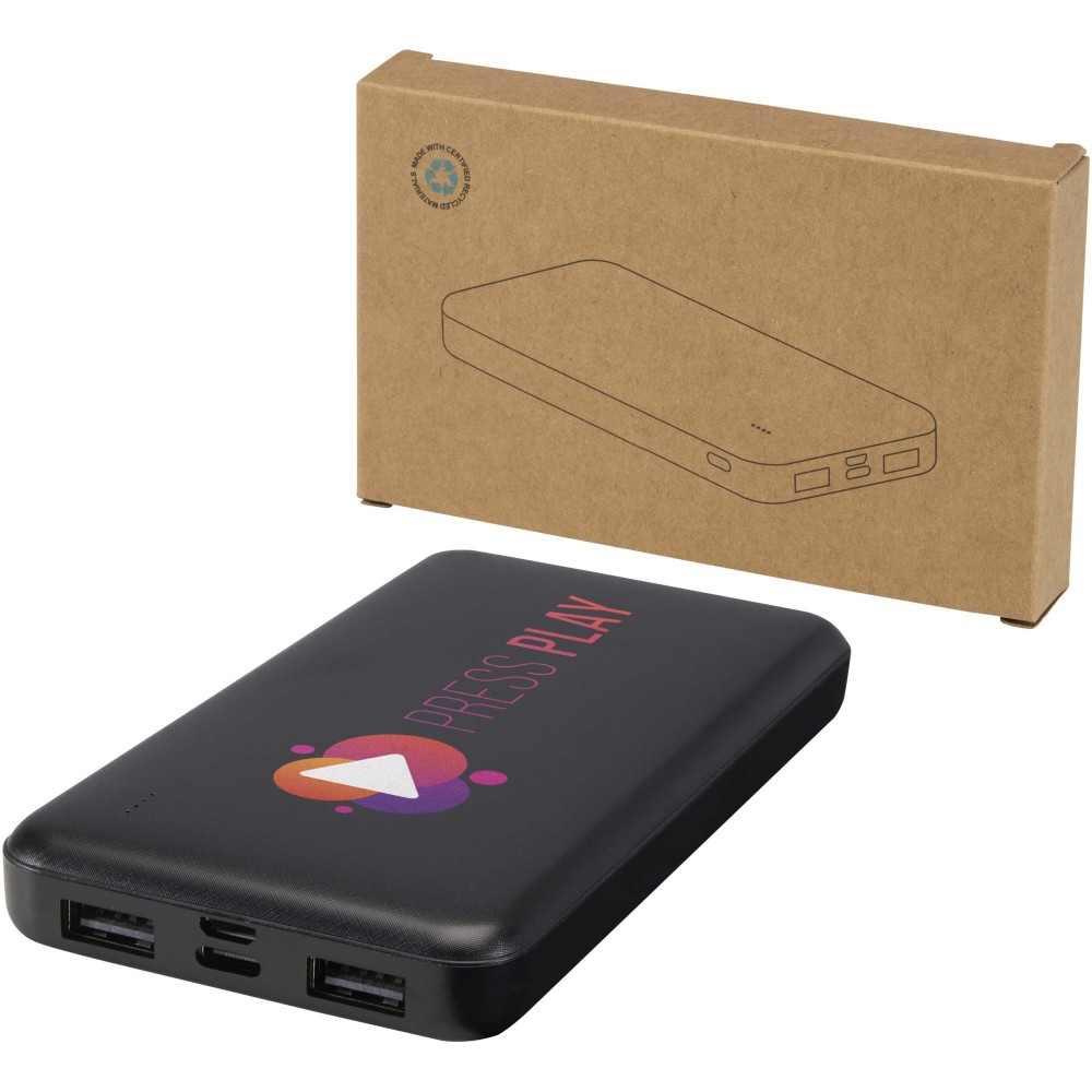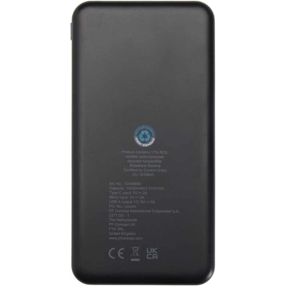Az Intan 10.000 mAh-s powerbank újrahasznosított műanyagból készül, megbízható energiát biztosítva egész napra. Két USB-A kimeneti porttal, egy Type-C bemenet/kimenettel és egy micro-USB bemenettel rendelkezik, így sokoldalú töltési lehetőségeket kínál. Karcsú kialakítása modern megjelenést ad, az integrált LED-jelző pedig egyértelműen mutatja a töltési állapotot. Emblémázás: UV nyomtatás
