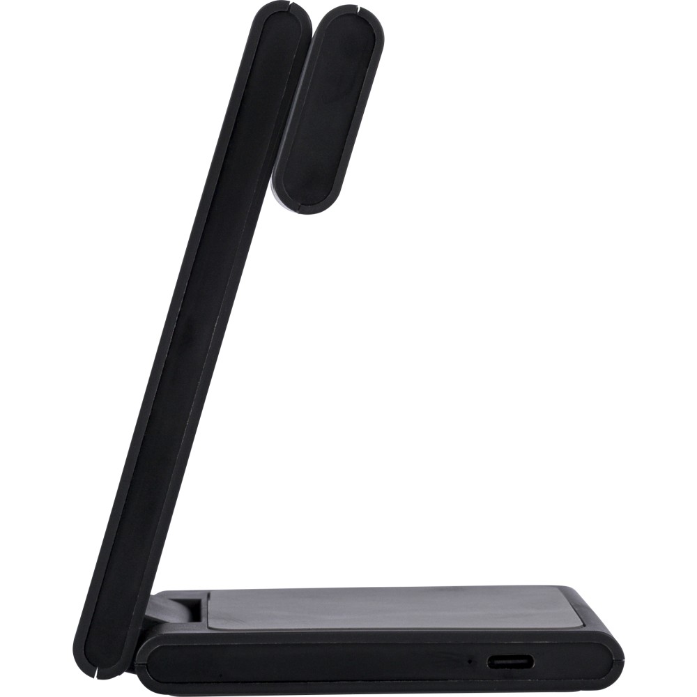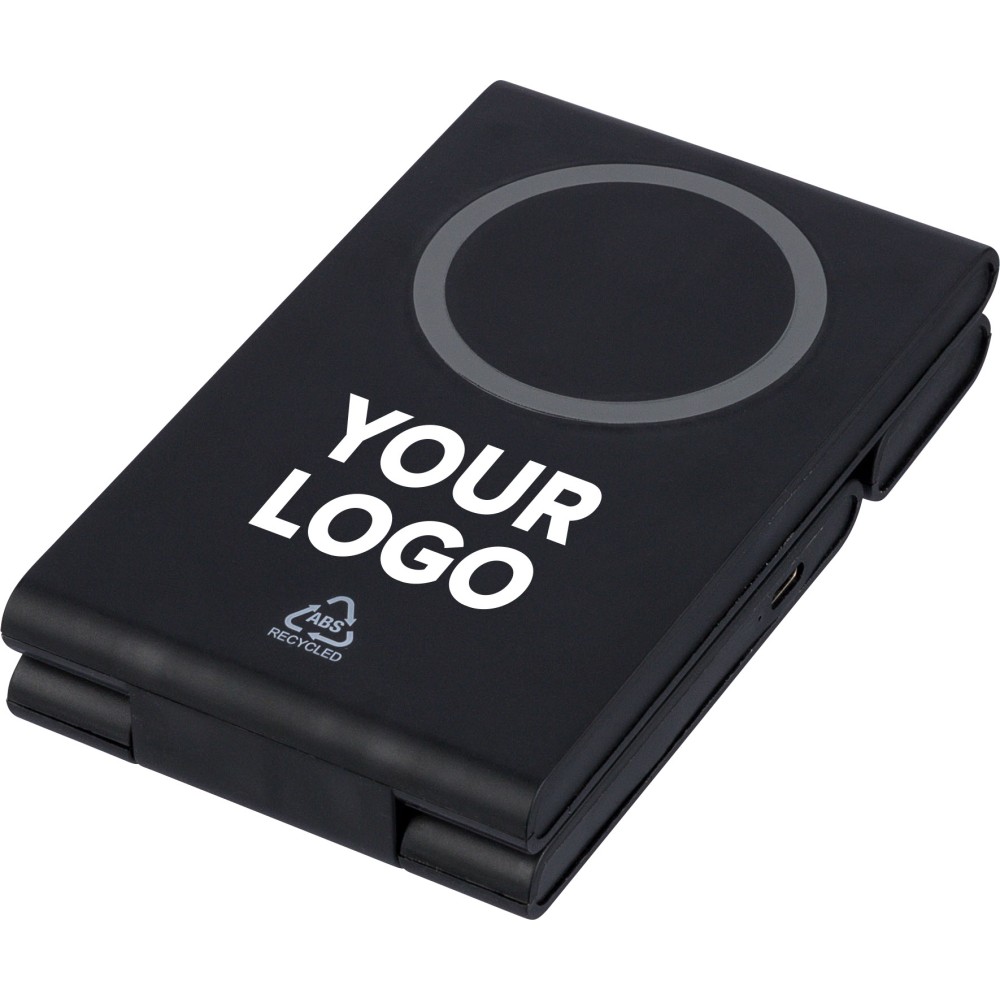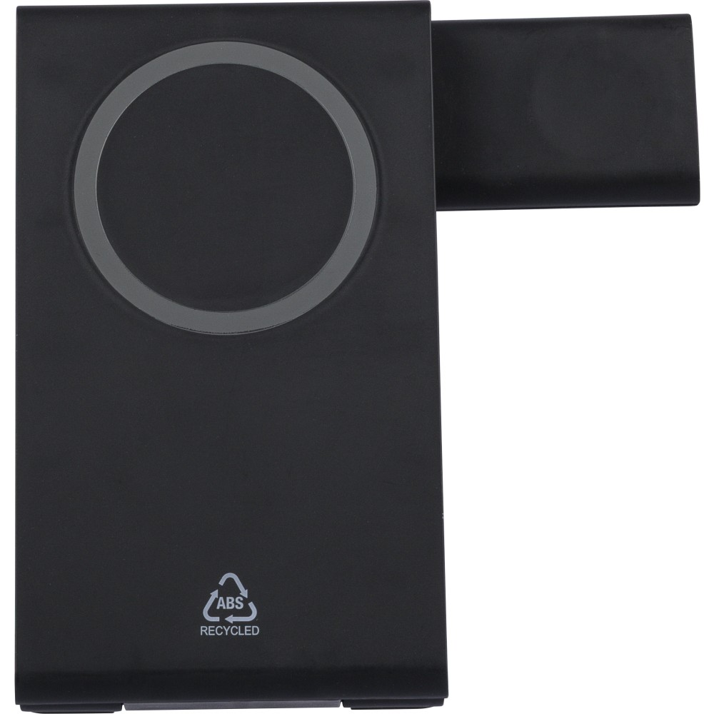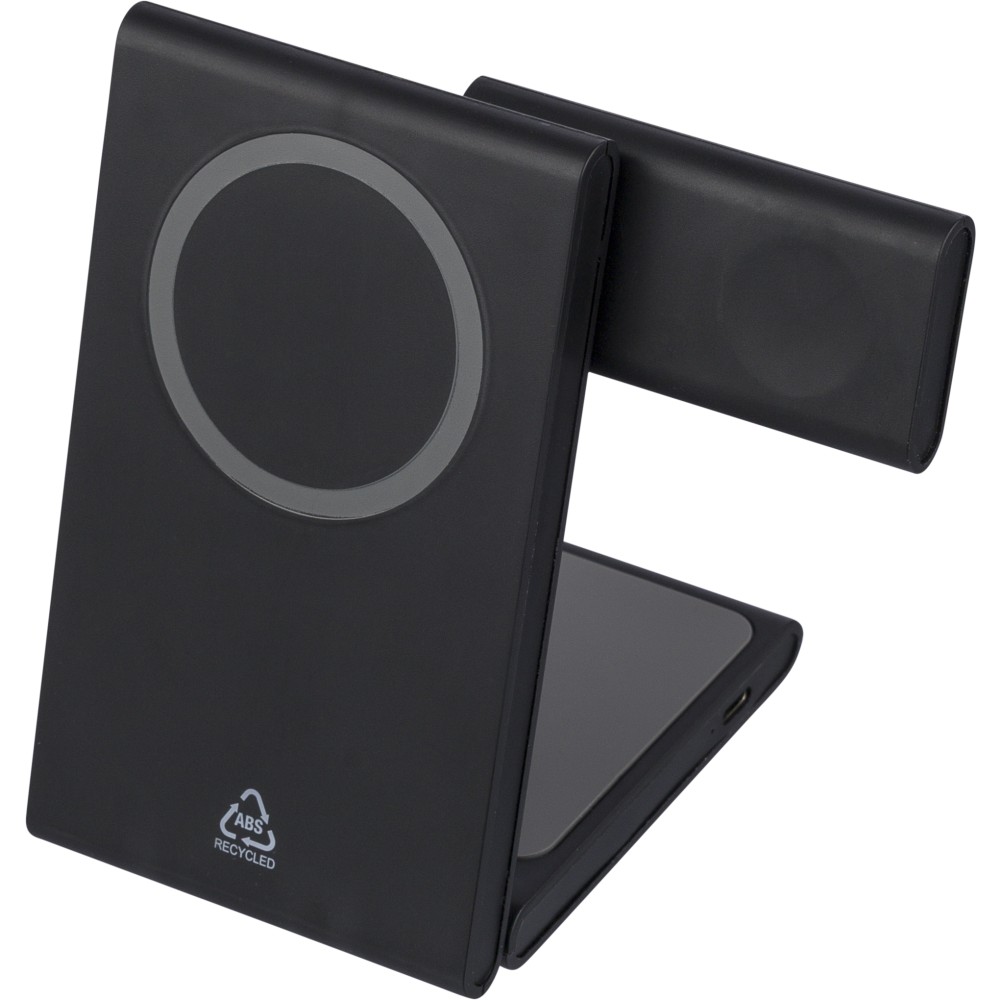 Újrahasznosított ABS-ből készült 3 az 1-ben mágneses töltő, amely 15W teljesítménnyel telefont, 5W-tal AirPods fülhallgatót, valamint 2W-tal iWatch okosórát tölt. Ultralapos kialakítású, felhajtható támasztékkal. Bemenet: 5V/3A vagy 9V/3A. A terméktesten recycled (újrahasznosított) alapanyagra utaló logó található. Barna dobozba csomagolva. Emblémázás: Tamponnyomás
