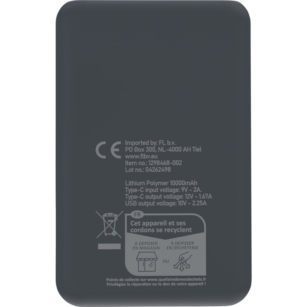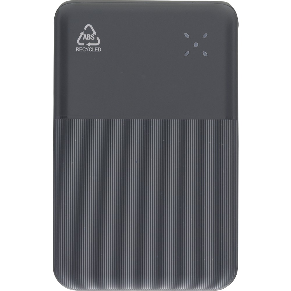 Újrahasznosított ABS anyagból készült powerbank 20 000 mAh kapacitással és 22,5 W gyors töltési teljesítménnyel. Type-C in/out és Type-A bemenettel, LED visszajelzővel és biztonsági védelmekkel. A hátoldalon gravírozott recycled (újrahasznosított) alapanyagra utaló logó található. Selyempapírral bélelt barna dobozba csomagolva. Emblémázás: UV nyomtatás