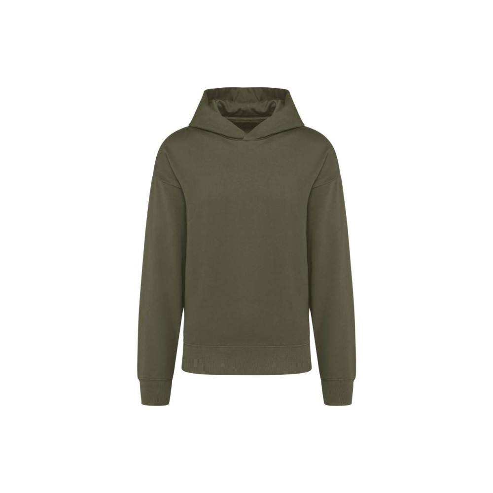 80% cotton / 20% polyester. Oversized fit with dropped shoulders. Brushed fleece. Carded cotton. 1x1 ribbing with a tubular finish on the cuffs and hem. Hidden pocket with invisible zip in the seam on the right side when worn. Cotton hood with double dart. Elastane in the ribbing on the cuffs and at the bottom of the garment to prevent them from going out of shape. Matching twill taped neck. Half-moon finish inside neck. Double overlaid overstitching on cuffs and bottom hem. No brand label on the collar. only a size tag for easy decoration. Emblémázás: Hímzés, Szitanyomás