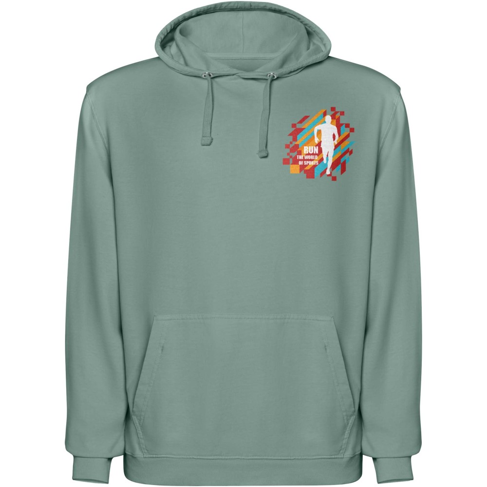 Koptatott (acid-wash) felületkezeléssel készült uniszex kapucnis pulóver, amely 2x1 bordás kötésű kézelőkkel és alsó szegéllyel készült. A kapucni színazonos single jersey bélést és passzoló lapos húzózsinórokat kapott, a nyakrésznél pedig esztétikus, színazonos fedőöltés található. A pulóver praktikus kenguruzsebbel rendelkezik a kényelmes használat érdekében. 100% pamut, 250 g/m2. Emblémázás: Hímzés, Szitanyomás