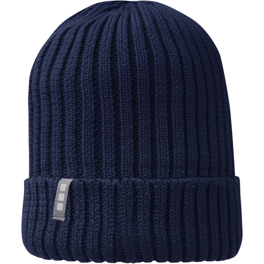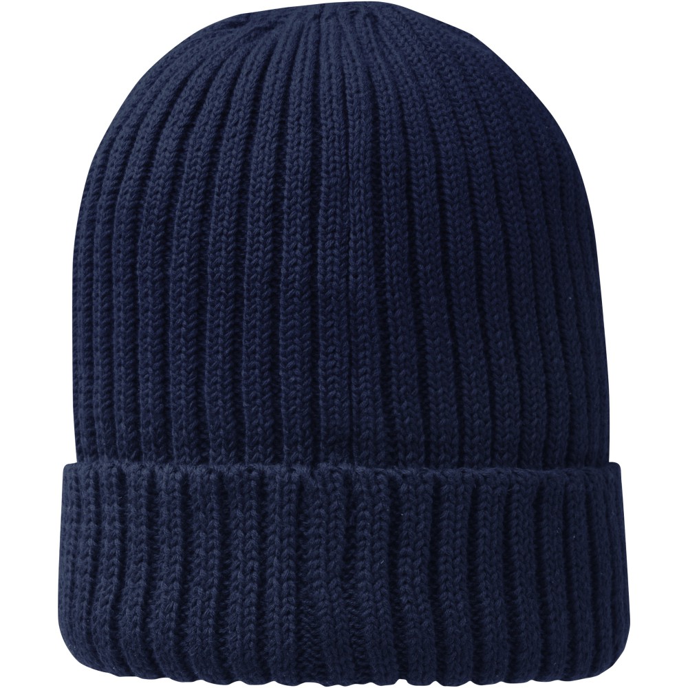 Egyrétegű sapka visszahajtókával, bevarrt márkajelzéssel. 2x2 bordás anyag. Organikus pamut. Emblémázás: Hímzés