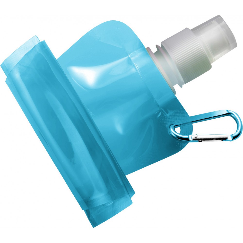Összehajtható vizeskulacs karabinerrel. Nem szivárgásmentes. Mosogatógépben nem tisztítható. 420ml. BPA-mentes műanyag. Emblémázás: Tamponnyomás