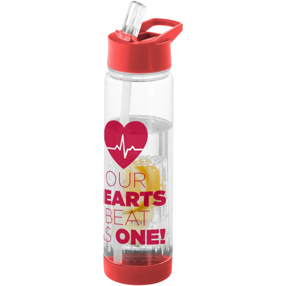 Tutti Frutti palack szűrőbetéttel, csavaros kupakkal, felpattintható ivócsővel. A szűrőbetétnek köszönhetően italunkba könnyen szűrhető módon tehetünk gyümölcsöt, zöldfűszert, zöldséget: mentát, citromfüvet, uborkát, levendulát, stb. A palack Eastman Tritan anyagból készült, így BPA-mentes, könnyű, tartós, szagmentes és ütésálló. Nem szivárgásmentes. Szénsavas italokkal nem használható. Mosogatógépben nem mosható és mikrohullámú sütőben történő melegítésre nem alkalmas. Űrtartalom: 740 ml. Emblémázás: Körszita, Tamponnyomás, UV nyomtatás
