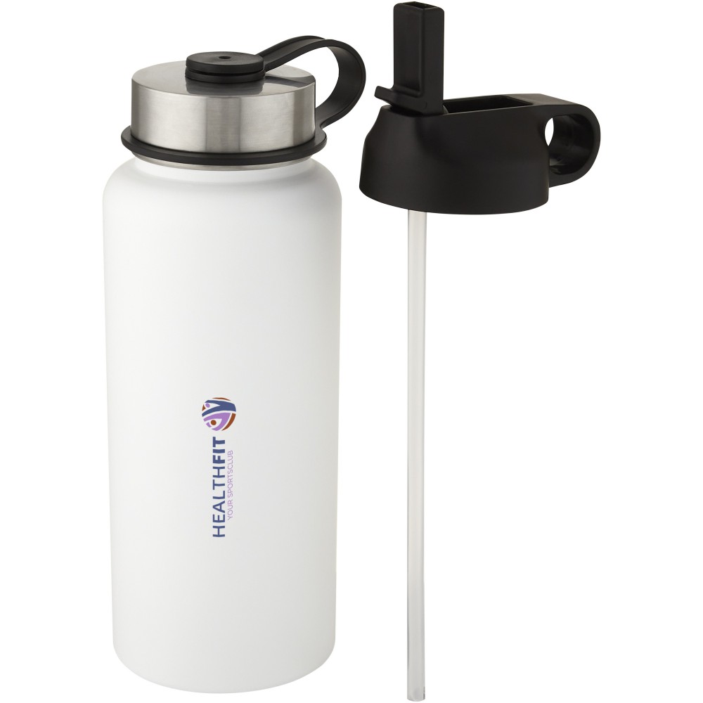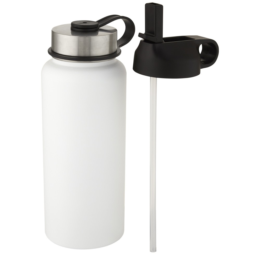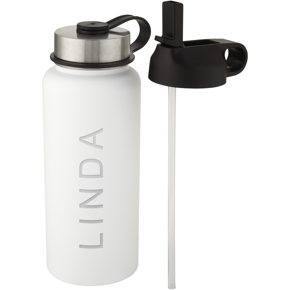 Kettő az egyben duplafalú, rozsdamentes acél sportpalack réz vákuumszigeteléssel, 2 fedéllel: egy szívószálas fedél és egy felcsavarható fedél hurokkal. A szigetelt 18/8-as rozsdamentes acél konstrukció megakadályozza a páralecsapódást a palack külső oldalán, a divatos matt bevonat pedig extra tartóssá teszi. Szélesen nyíló száj a könnyű feltöltéshez, kiöntéshez és tisztításhoz. BPA-mentes, a német élelmiszerbiztonsági törvény (LFGB) szerint tesztelt és jóváhagyott. Ftaláttartalomra tesztelve és jóváhagyva a REACH előírásai szerint. Jégkockákhoz tökéletes. Szivárgásmentes. Szénsavas italokkal nem használható. Mosogatógépben nem mosható és mikrohullámú sütőben történő melegítésre nem alkalmas. Nagy űrtartalmú palack: 1L. Újrahasznosított karton díszdobozban. Emblémázás: UV nyomtatás