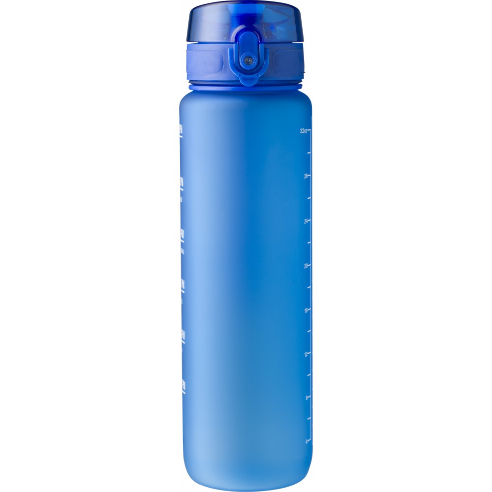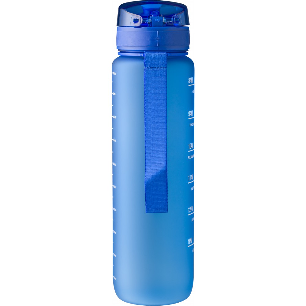 Műanyag motivációs palack szivárgásmentes kupakkal, csuklópánttal, matt bevonattal. Oldalán beosztással. Űrtartalom: 1 liter. Emblémázás: Tamponnyomás, UV nyomtatás