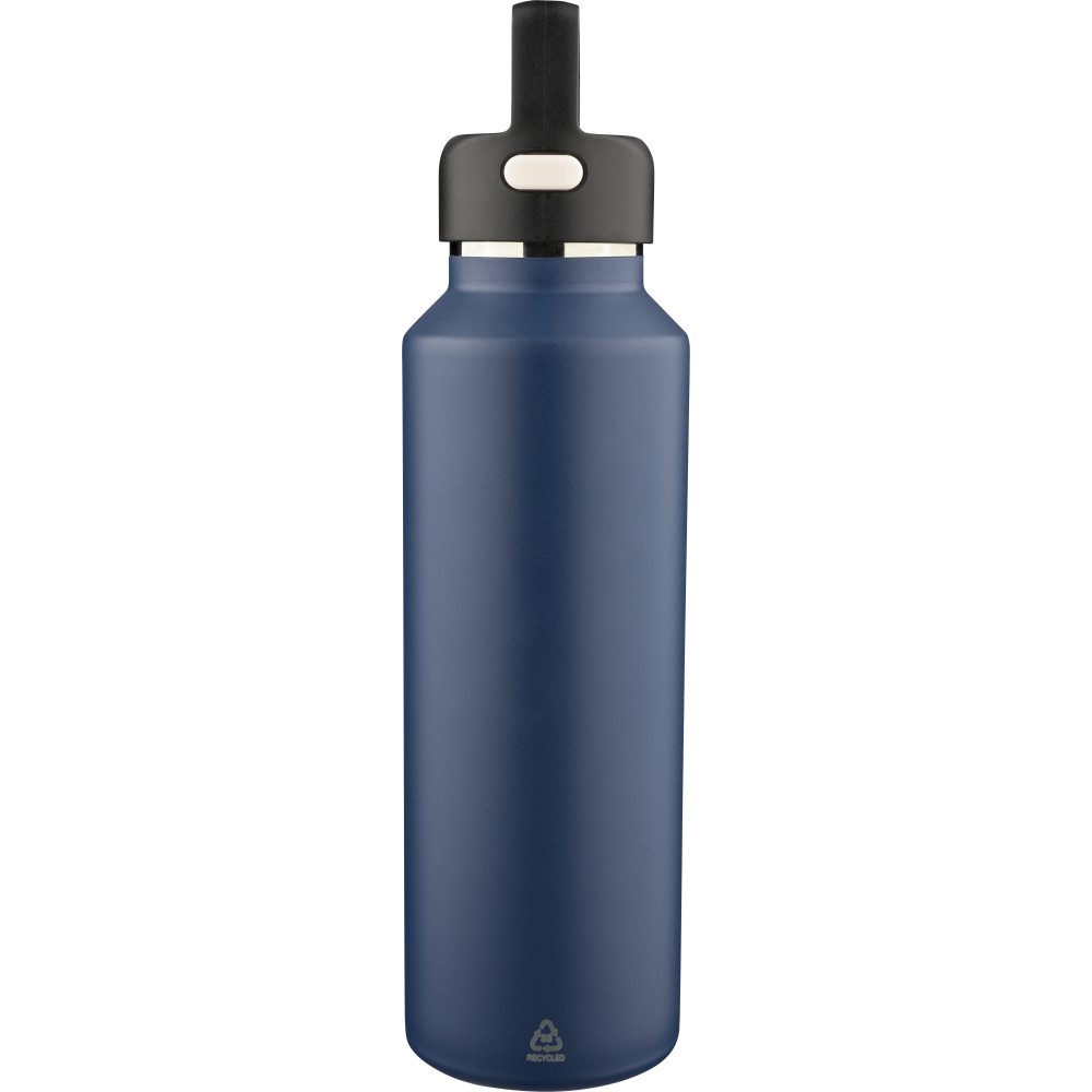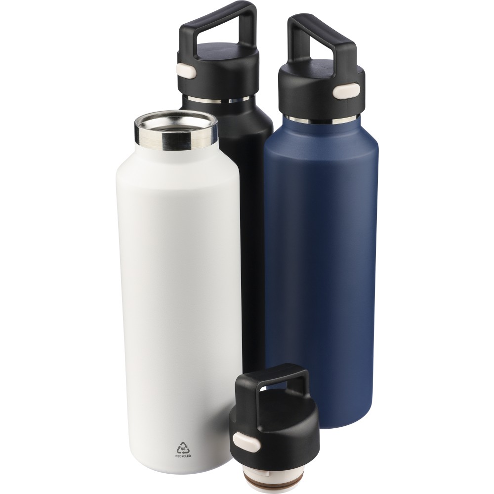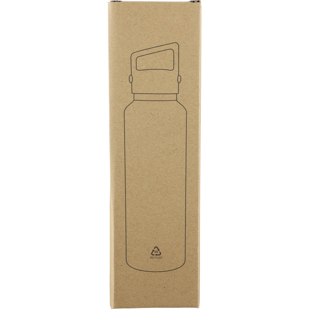 Újrahasznosított rozsdamentes acélból készült, vákuumszigetelésű palack 600 ml űrtartalommal, duplafalú kialakítással, hordozófüllel ellátott PP fedéllel és kétféle (dupla) nyitási lehetőséget biztosító nyomógombos rendszerrel. A palacktesten lézergravírozott recycled (újrahasznosított) alapanyagra utaló logó található. Darabonként barna kartondobozba csomagolva. Emblémázás: Bögredekor