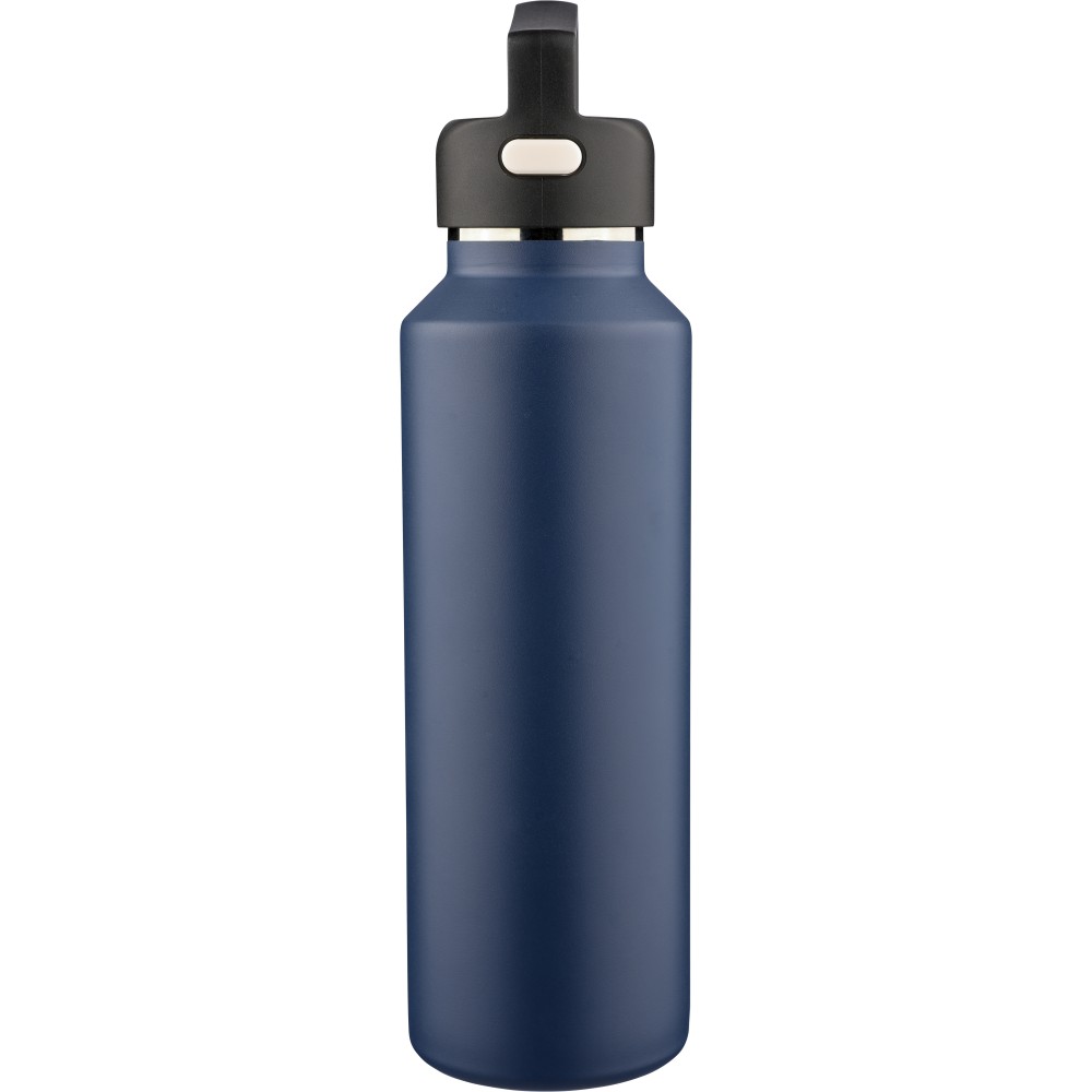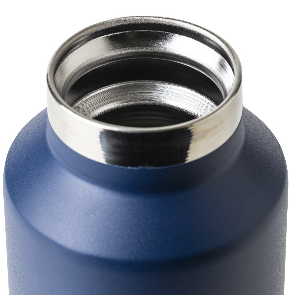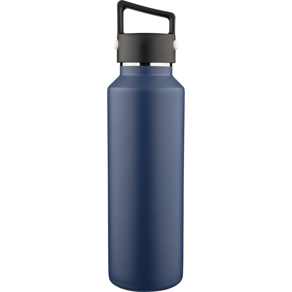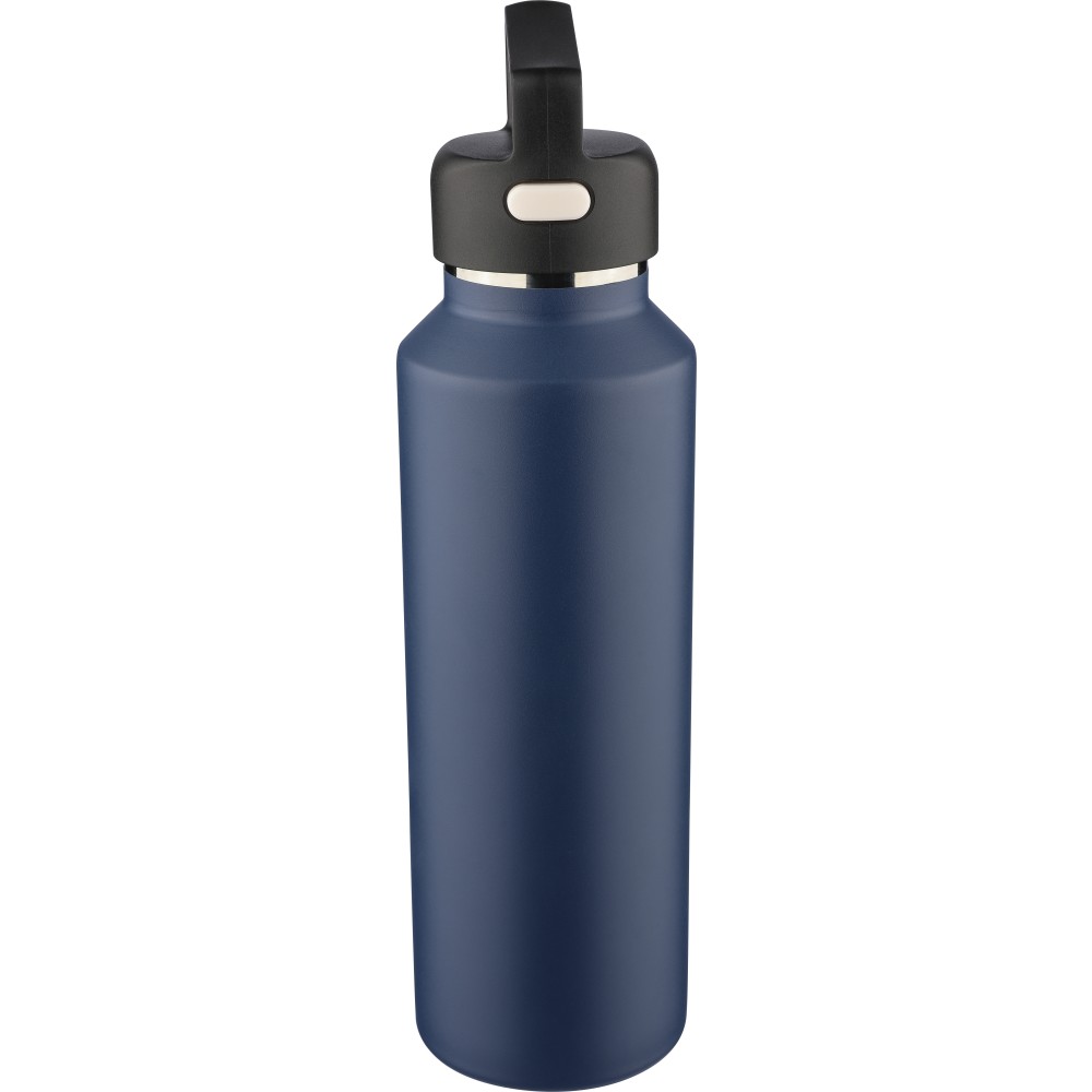Újrahasznosított rozsdamentes acélból készült, vákuumszigetelésű palack 600 ml űrtartalommal, duplafalú kialakítással, hordozófüllel ellátott PP fedéllel és kétféle (dupla) nyitási lehetőséget biztosító nyomógombos rendszerrel. A palacktesten lézergravírozott recycled (újrahasznosított) alapanyagra utaló logó található. Darabonként barna kartondobozba csomagolva. Emblémázás: Bögredekor