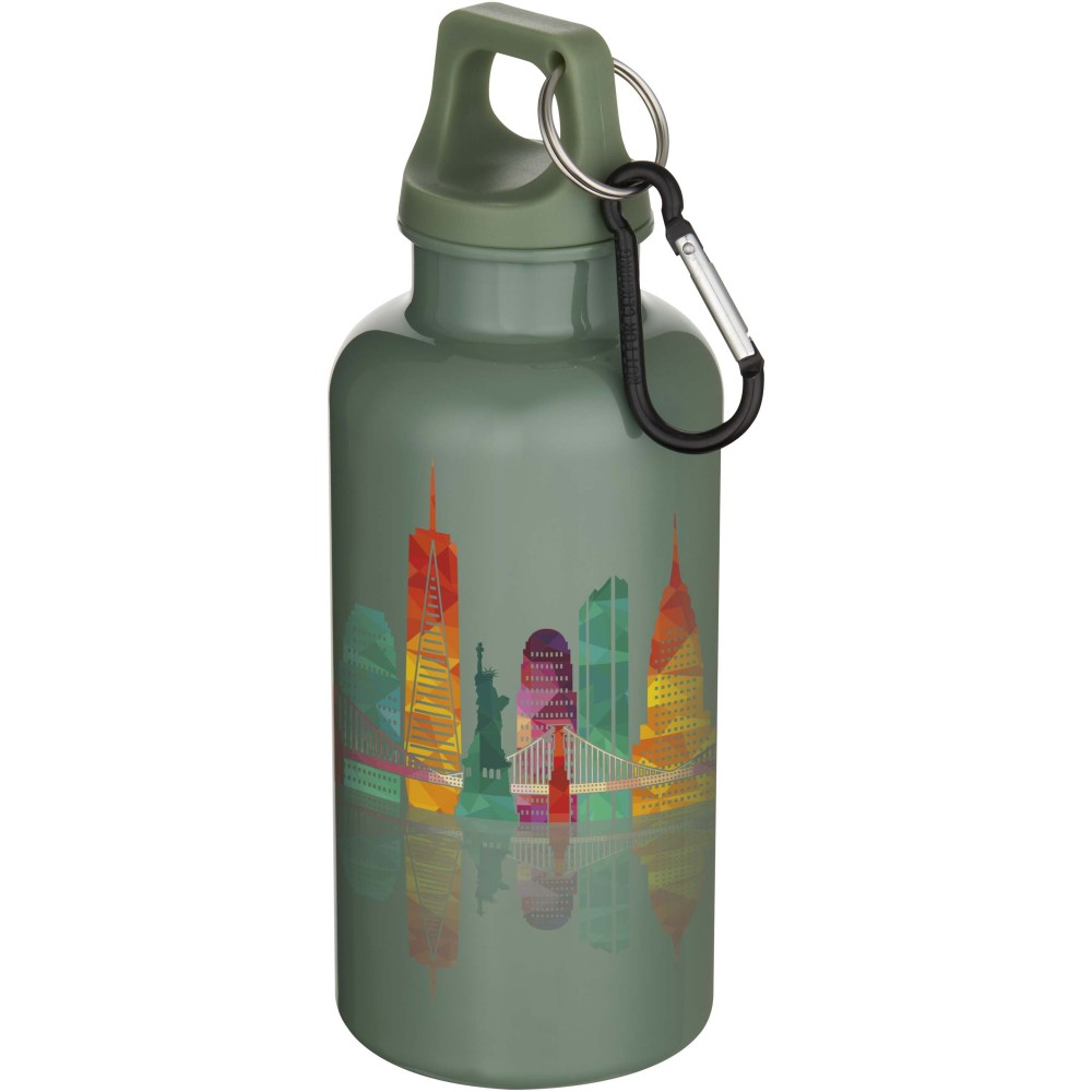 Az RCS tanúsítvánnyal rendelkező RPET-ből készült, tartós, mégis könnyű, 400 ml-es kulacs lehetővé teszi a folyamatos hidratálást. Tökéletes kísérő sportoláshoz, kirándulásokhoz vagy irodai használatra. A szimplafalú Oregon palack csavaros kupakkal rendelkezik, és bőséges felületet kínál bármilyen logó elhelyezésére. A mellékelt karabiner segítségével (mely mászásra nem alkalmas) a kulacs biztonságosan táskához rögzíthető. A termék megfelel az EFSA által jóváhagyott PET újrahasznosítási szabályoknak. Emblémázás: Tamponnyomás