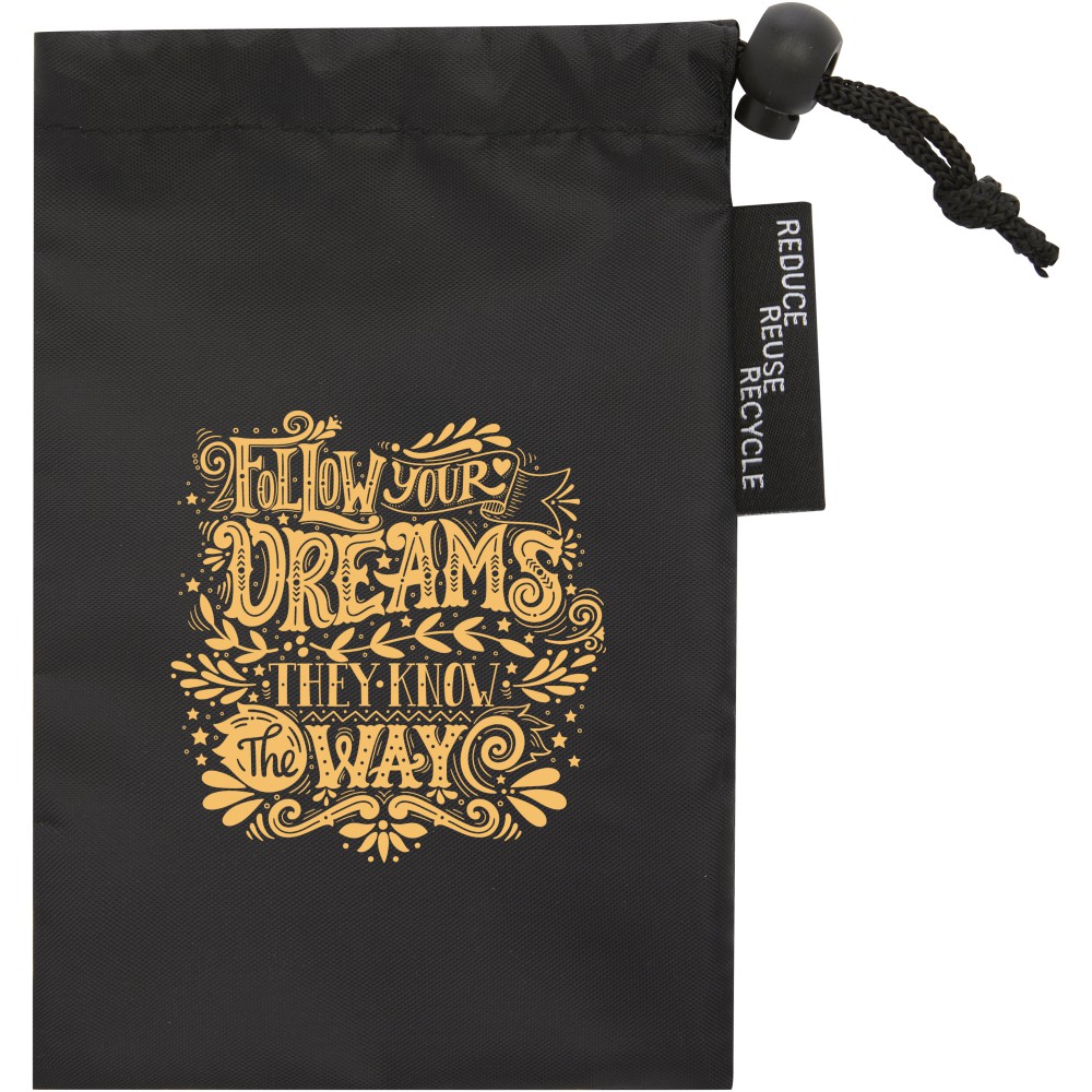 Újrahasznosított poliészterből (RPET) készült jógaszalag. Az RPET használata segít csökkenteni a pazarlást és elősegíti a környezet fenntarthatóságát. Az újrahasznosított műanyagok felhasználásával az új műanyagok keletkezése minimálisra csökken, így fenntarthatóbb választás. Mérete: 181 x 3,8 cm. A tasak is RPET-ből készült. Emblémázás: Szitanyomás